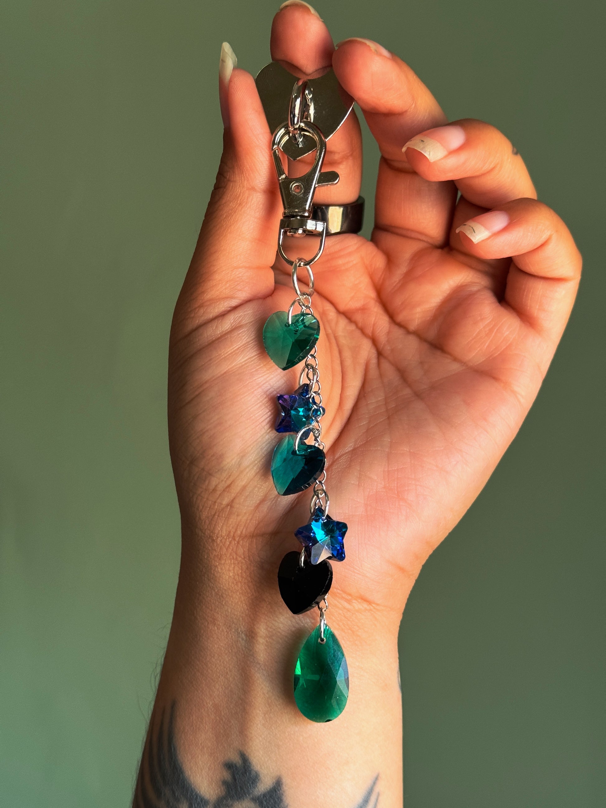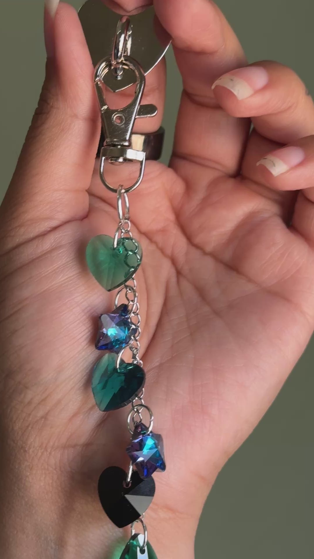 Banished is created with a light green heart charm, a blue and purple star charm, a teal heart charm, a black heart charm, and a dark green tear drop charm.