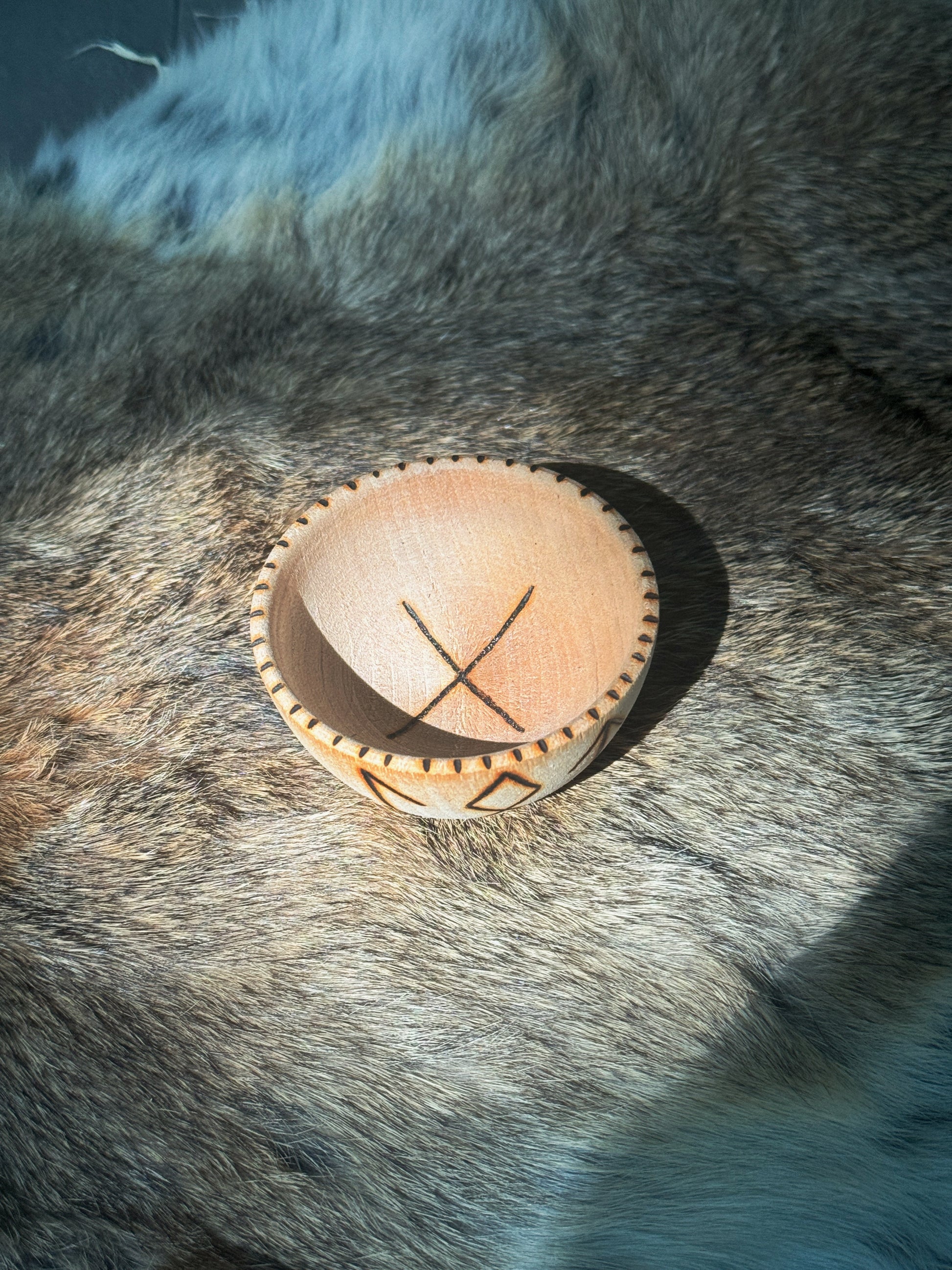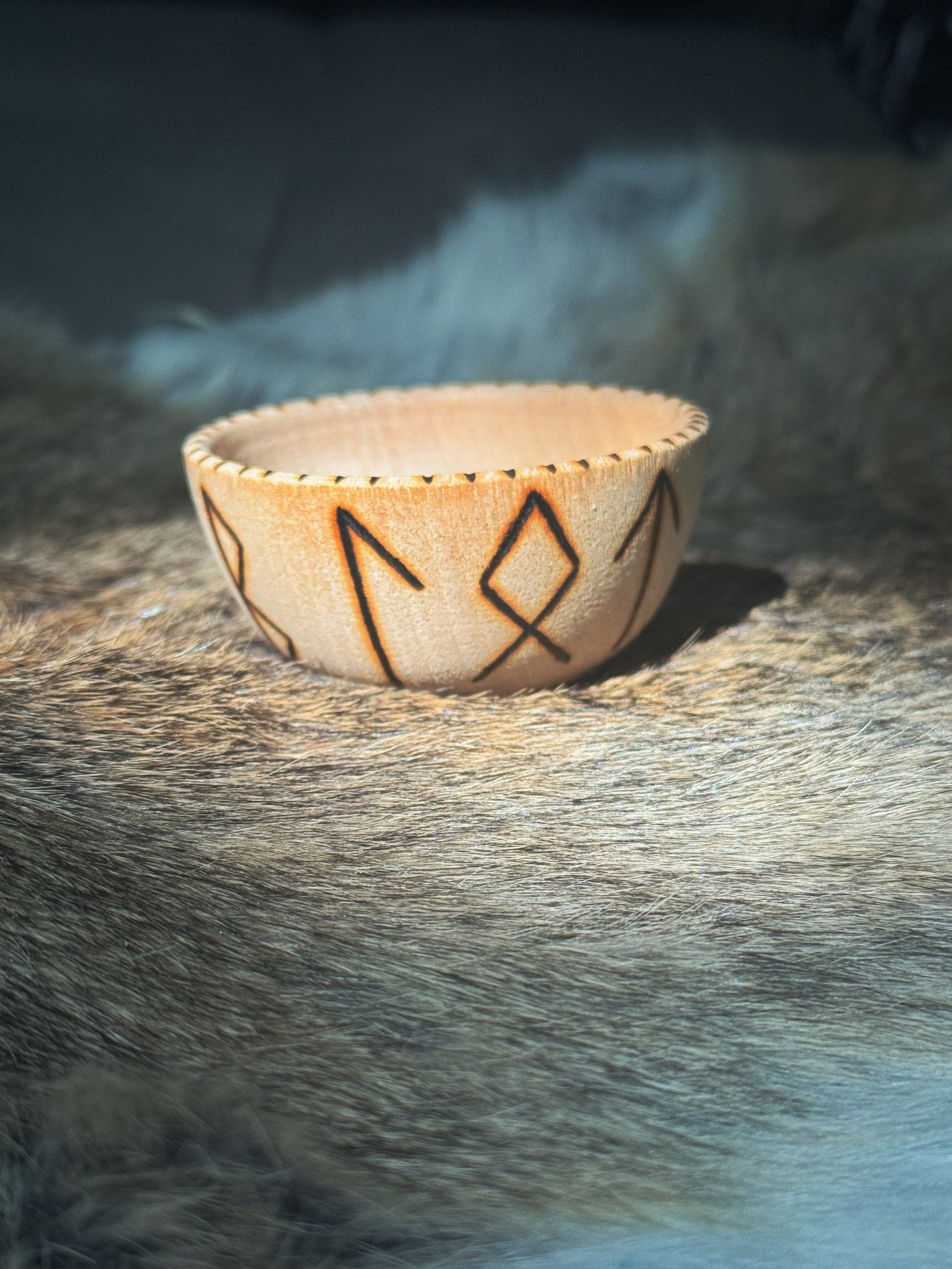 Hand burned BLOT mini bowl. A BLOT is a sacrifice, it can be physical or spiritual or even emotional. The Elder Futhark rune Gebo representing gift, offering, and balance can be found in the middle. You will receive the bowl pictured and it is roughly 2.5" wide.