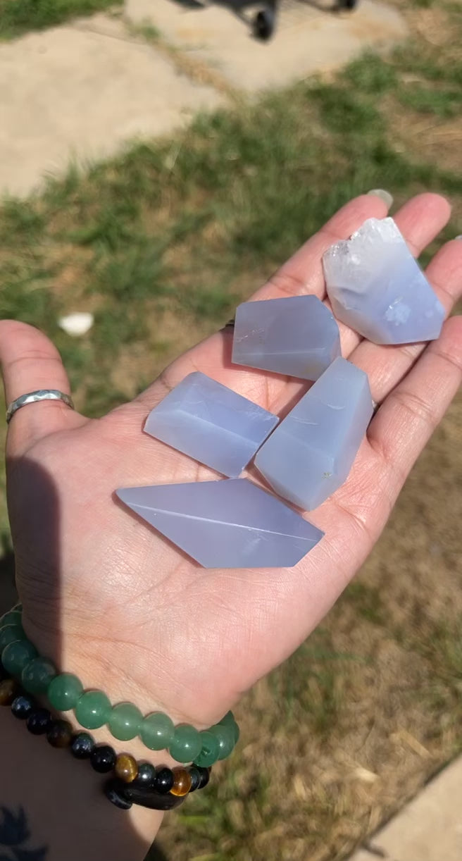 Blue Chalcedony corresponds to the throat chakra and the third eye chakra. It aids in calming, communication, and increases self confidence. Its a very nurturing stone.