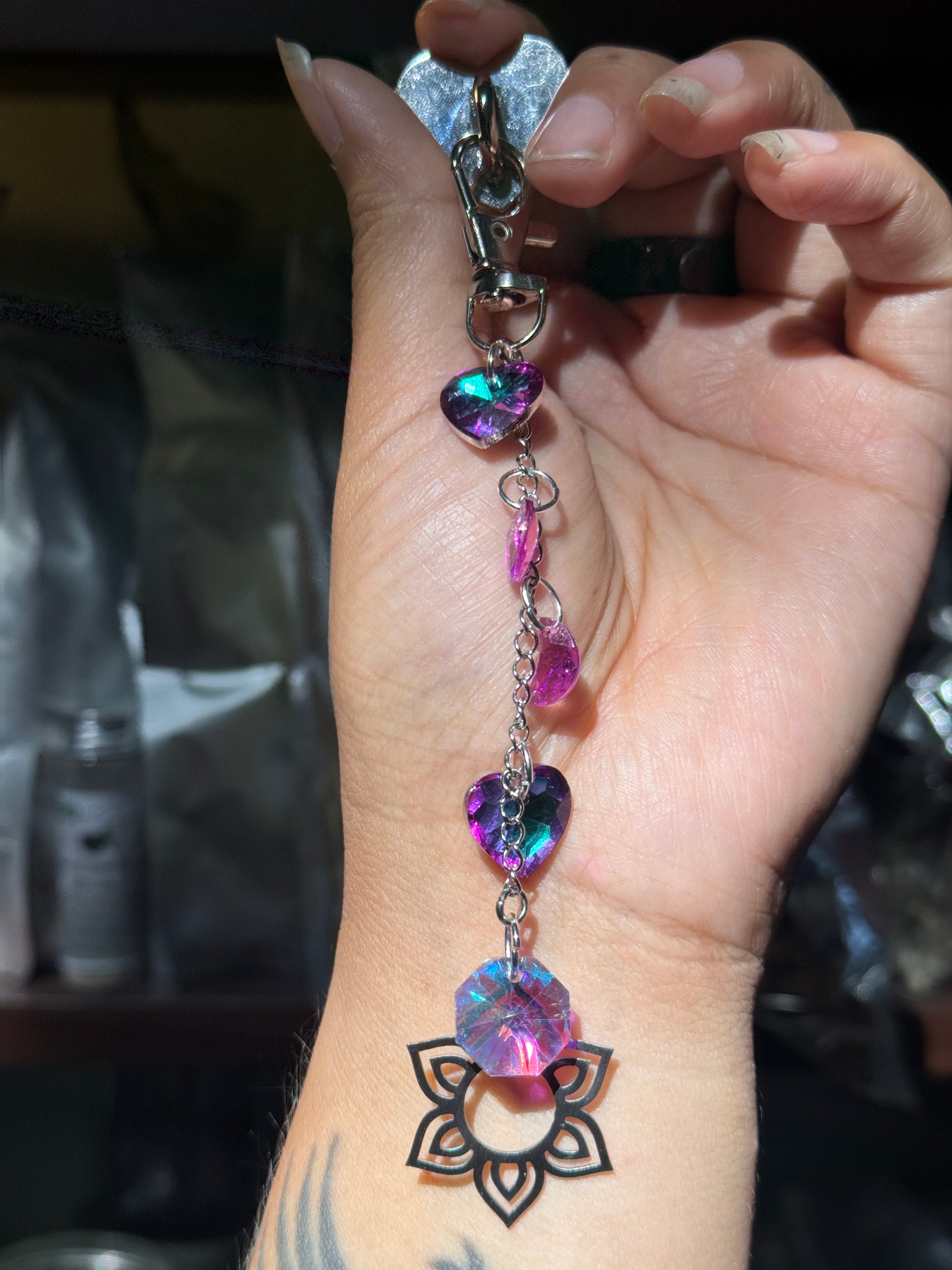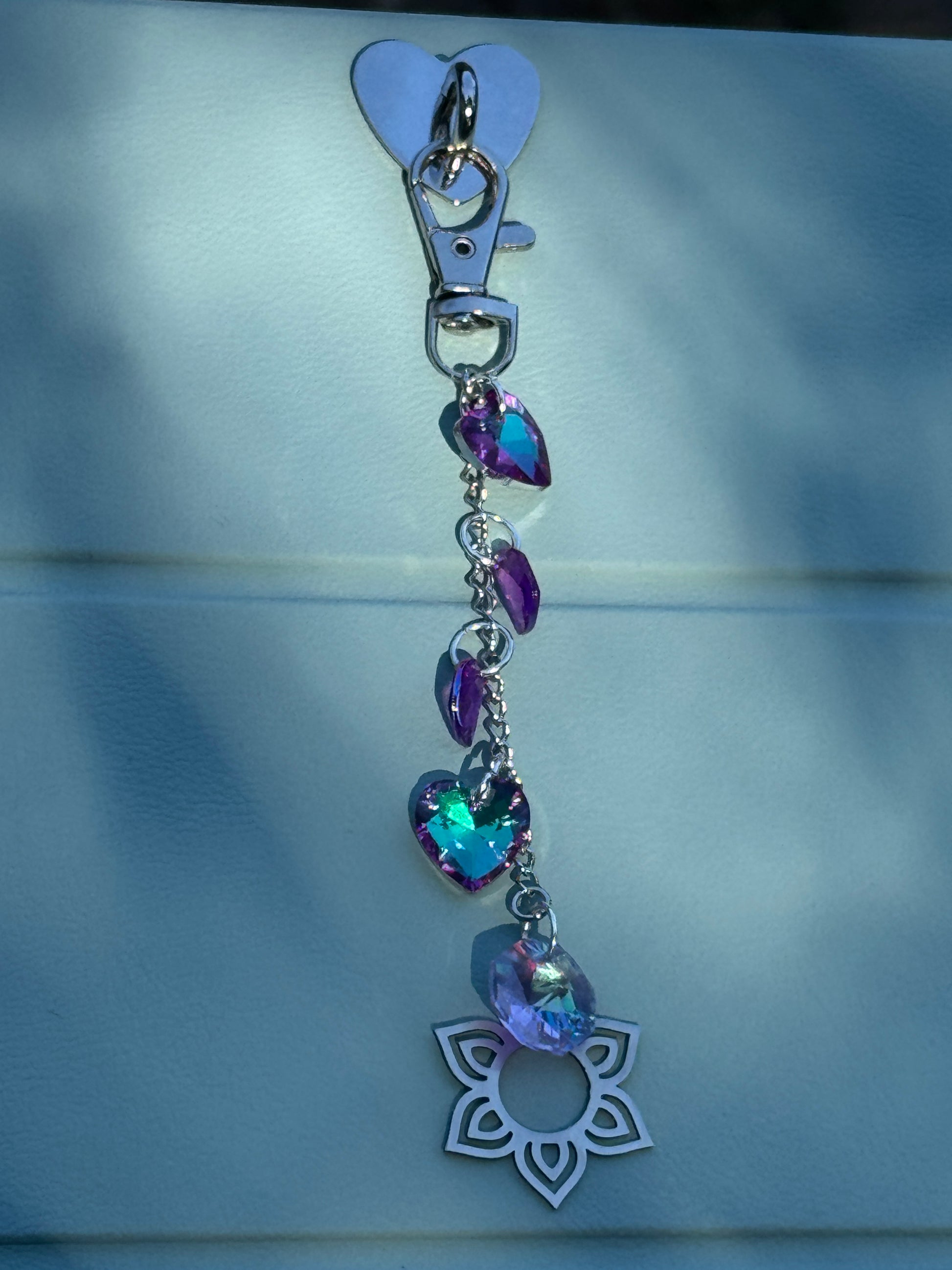Boho Babe charm has 2 green/purple heart charms, 2 lilac crescent moons, 1 lilac octagon, and 1 mandala.