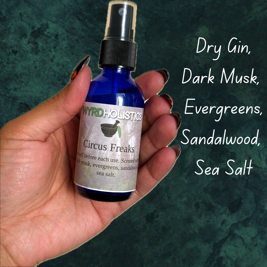 Circus Freaks is scented with dry gin, dark musk, evergreens, sandalwood, and sea salt. You will receive 1 2oz spray bottle.