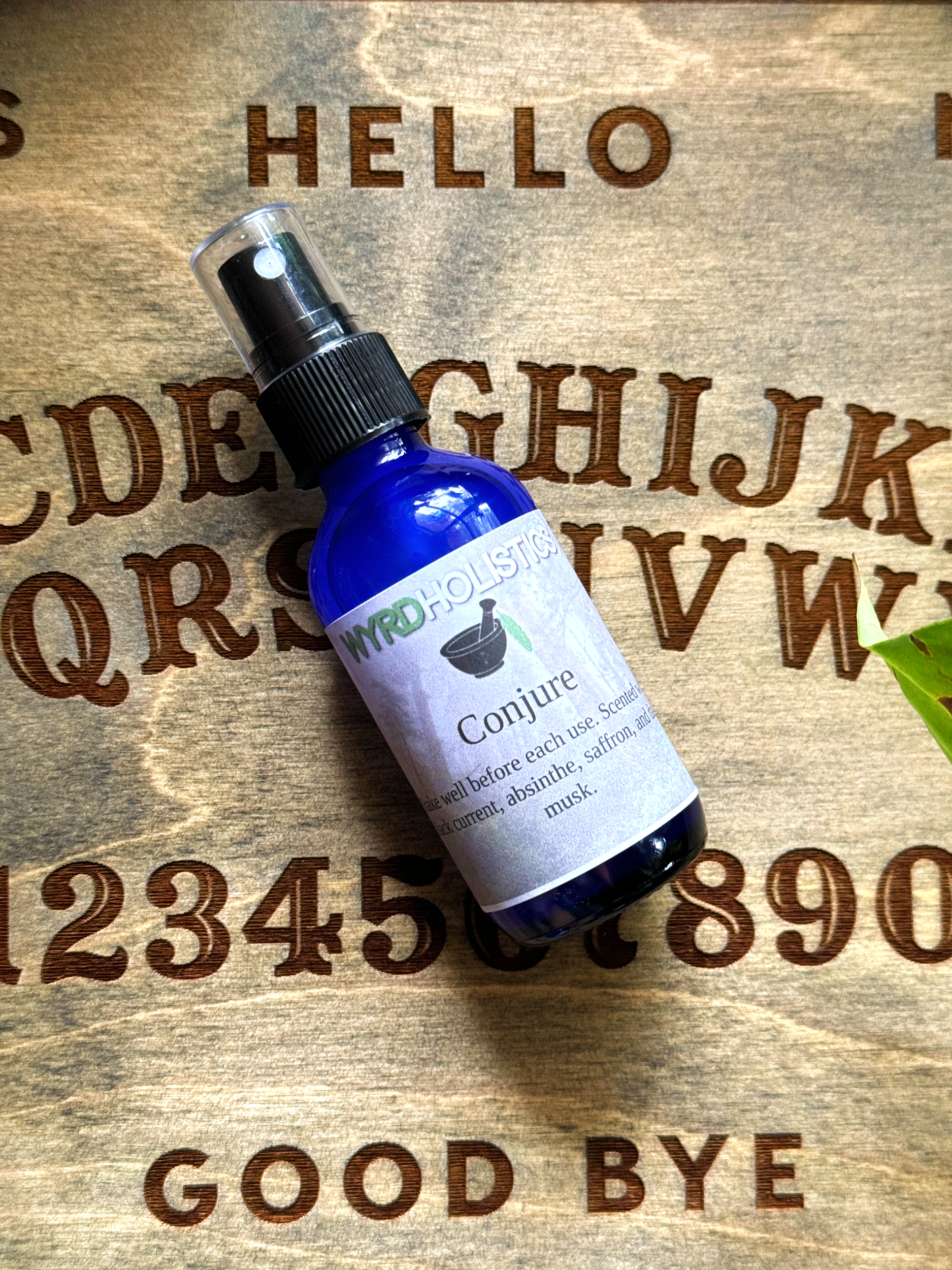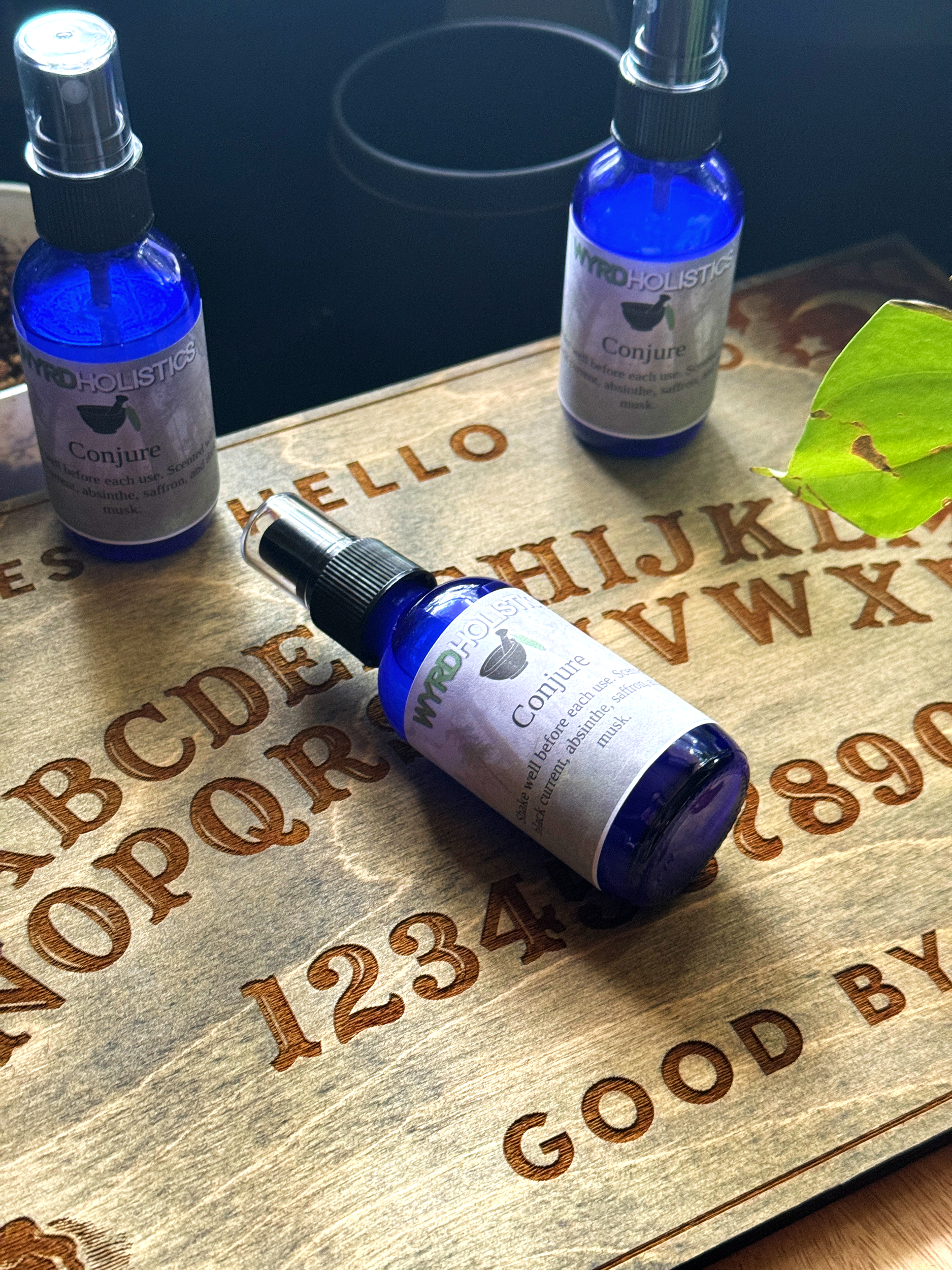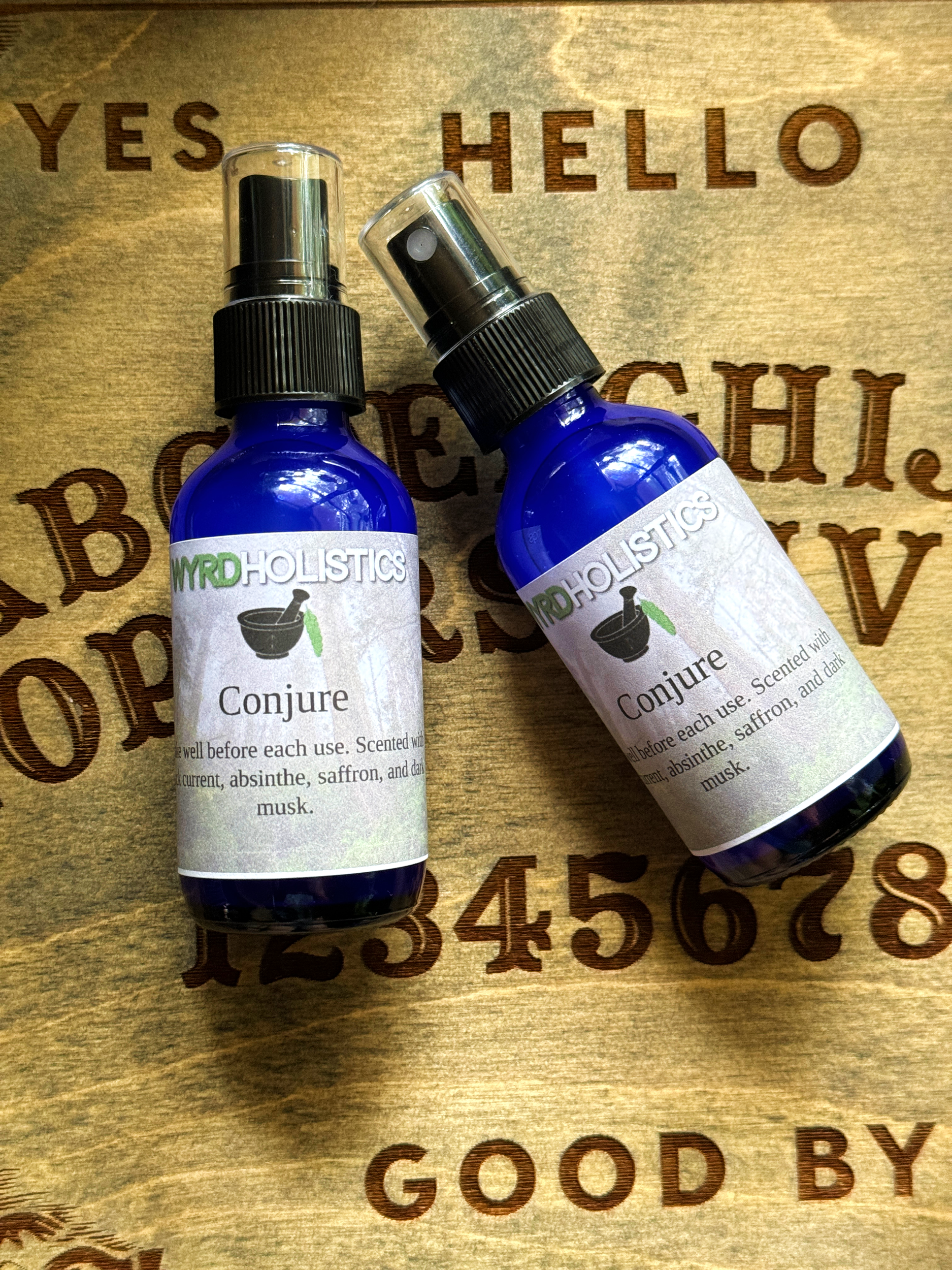 Conjure is scented with black current, absinthe, saffron, and dark musk. You will receive 1 2oz spray bottle.
