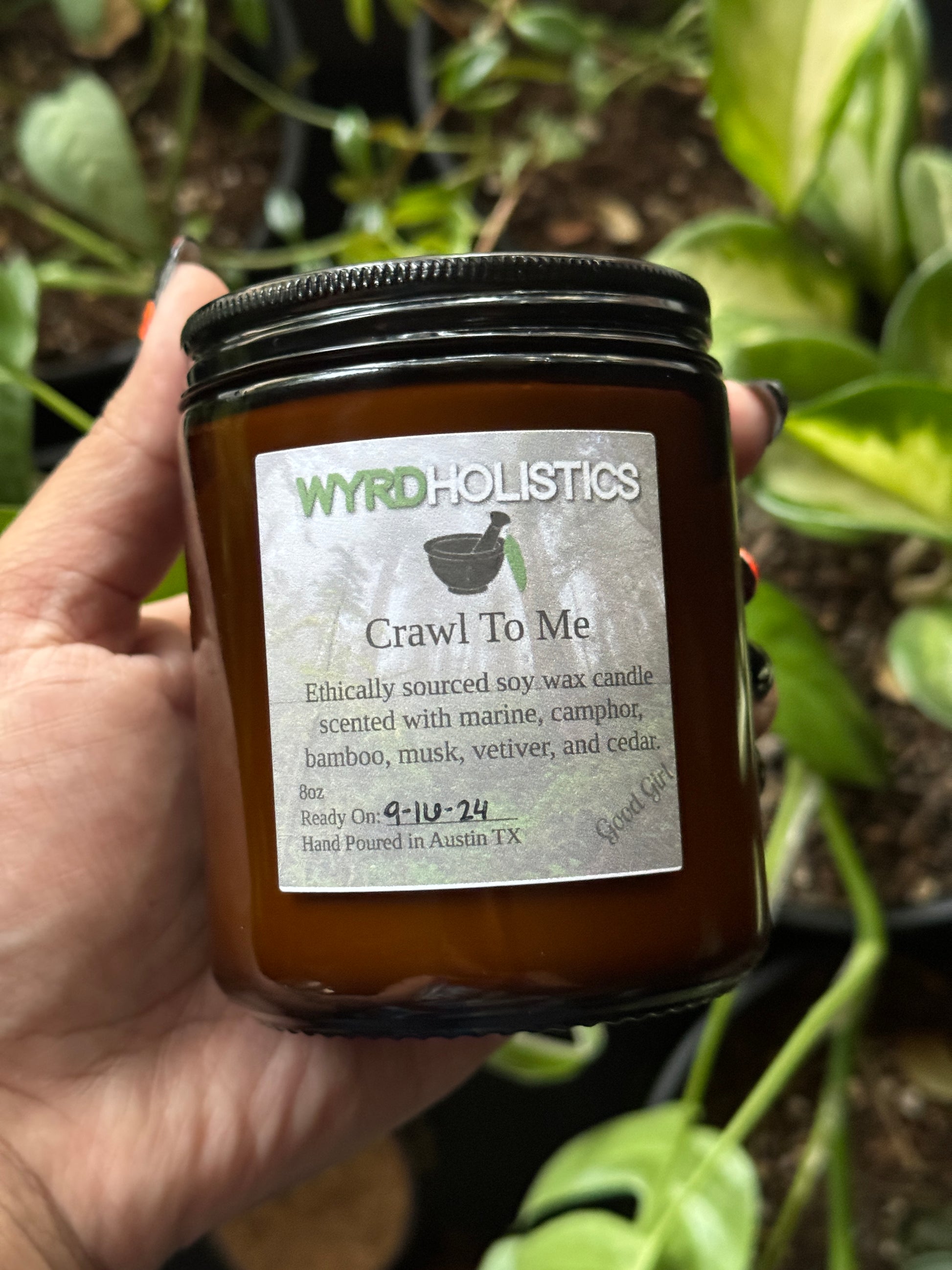 Crawl To Me is scented with marine, camphor, bamboo, musk, vetiver, and cedar. You will receive 1 wood wick candle.