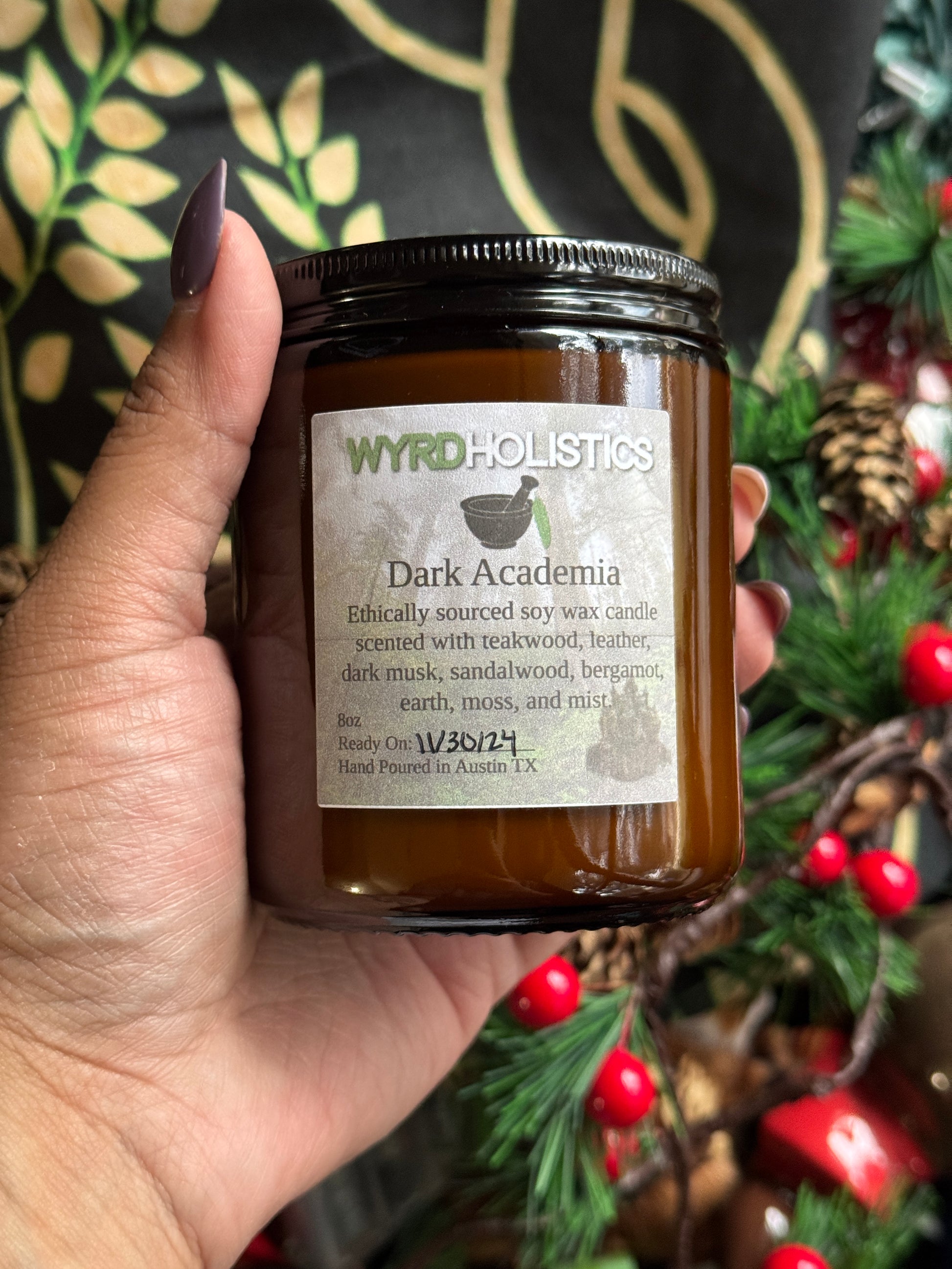 Dark Academia is scented with leather, dark musk, sandalwood, bergamot, earth, moss, and mist. You will receive 1 wood wick candle.
