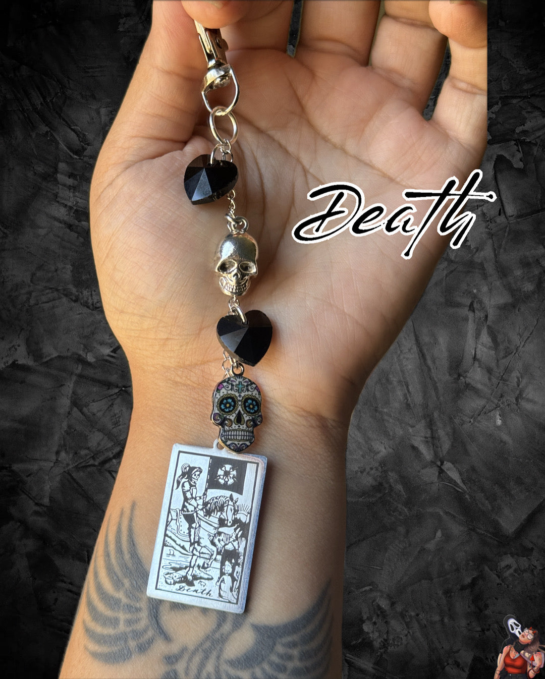 Death features a sugar skull, a silver skull, and 2 black hearts.