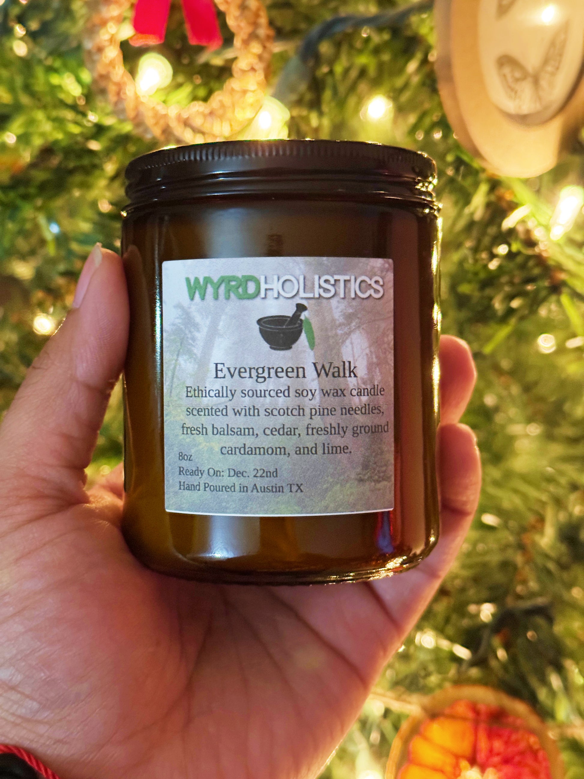 We use ethically sourced organic soy wax, vegan cruelty free fragrance oil, and a glass container for you to reuse! We also hand pour each and every candle we produce! Evergreen Walk is scented with scotch pine needles, fresh balsam, cedar, freshly ground cardamom, and lime.