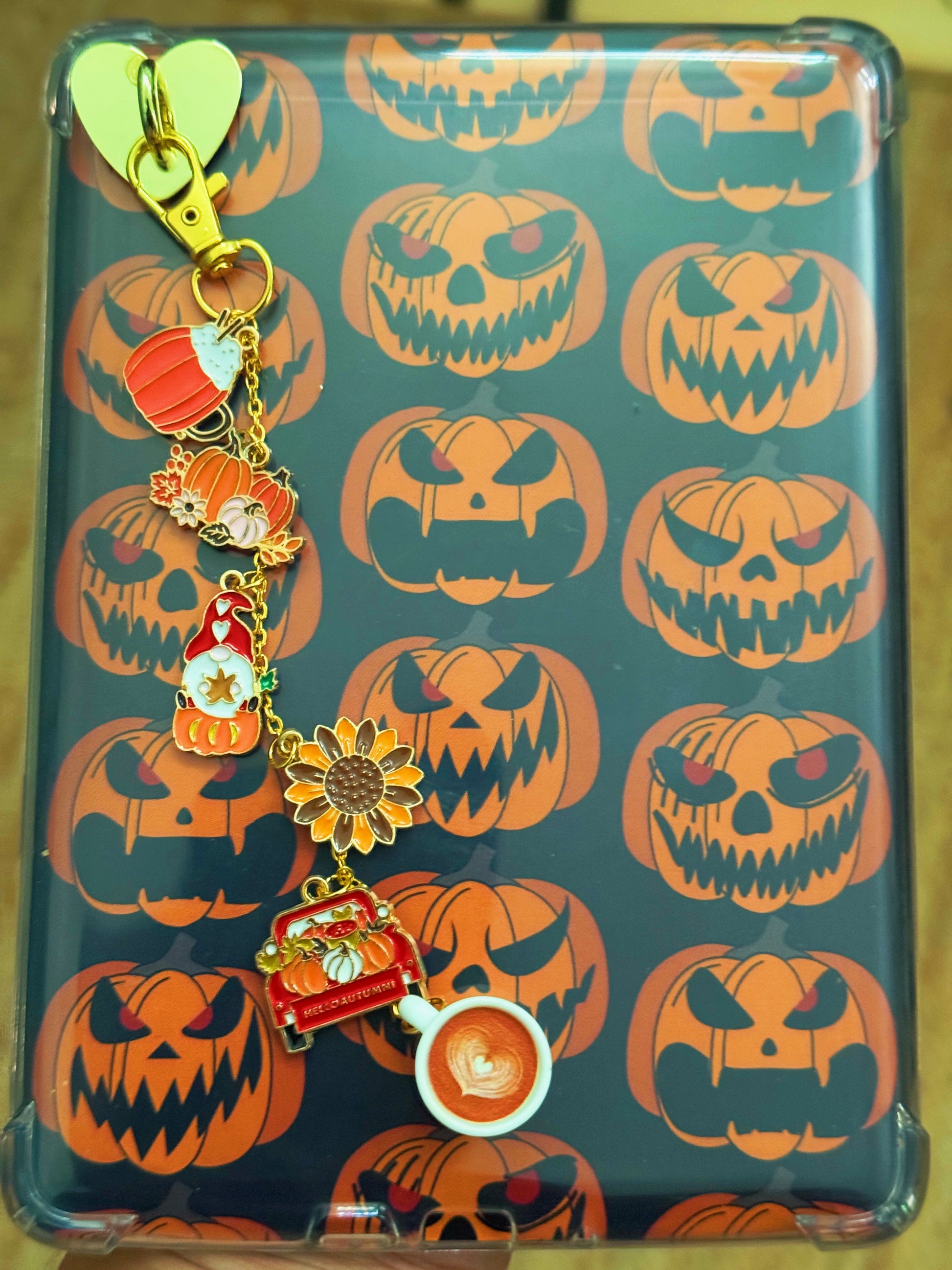Fall Days is a gold base with a pumpkin spice latte, flowers with a pumpkin, a gnome holding a star anise, a sunflower, a classic Hello Autumn truck, and a hot cup off coffee!