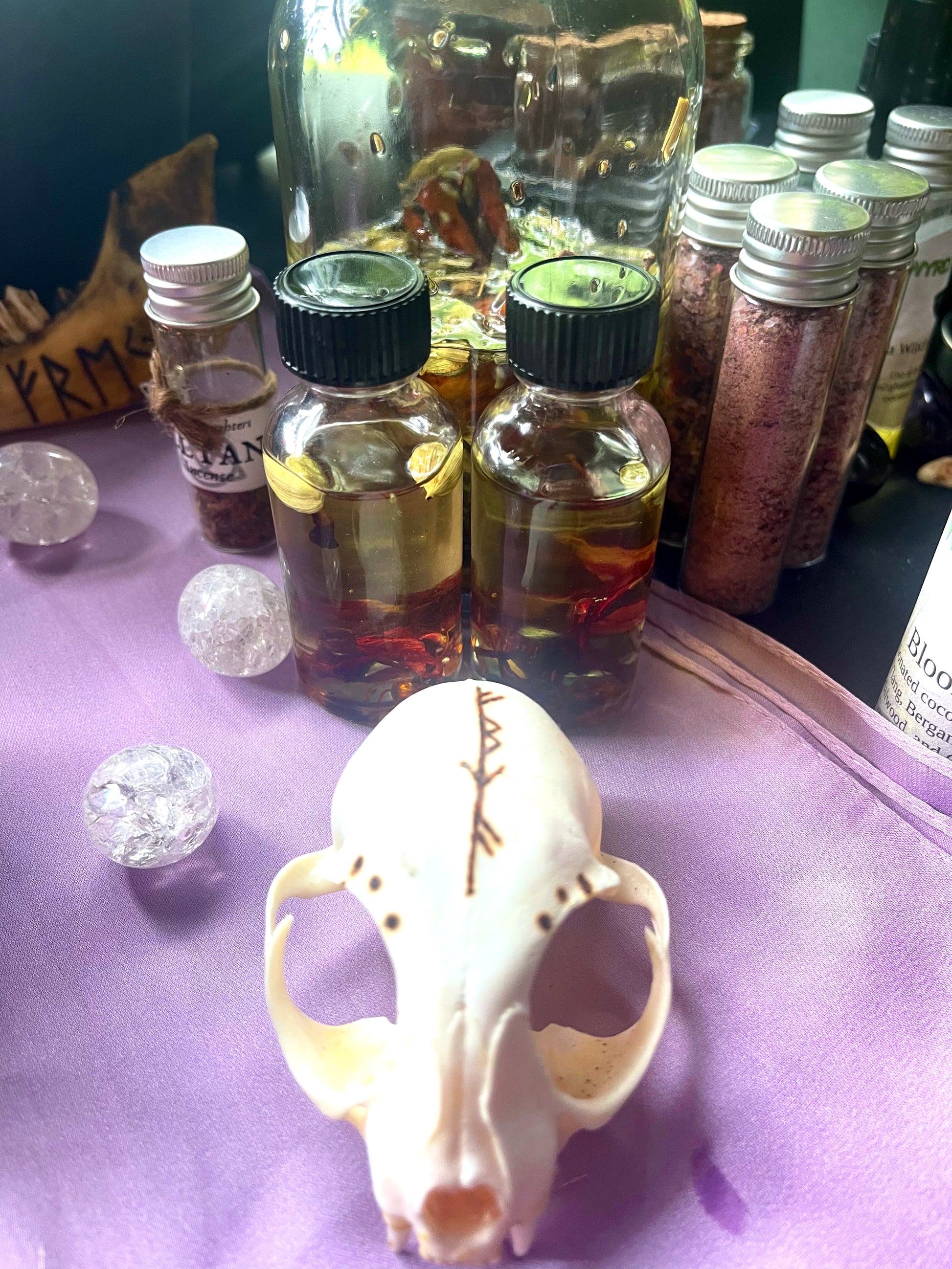 This oil was created on Friday (Freyas Day) and infused for 3 weeks then strained on Beltane! This oil was infused with sweet almond oil, cardamom, saffron, rose quartz, patchouli essential oil, and other herbs and oils to help you conquer your partner.