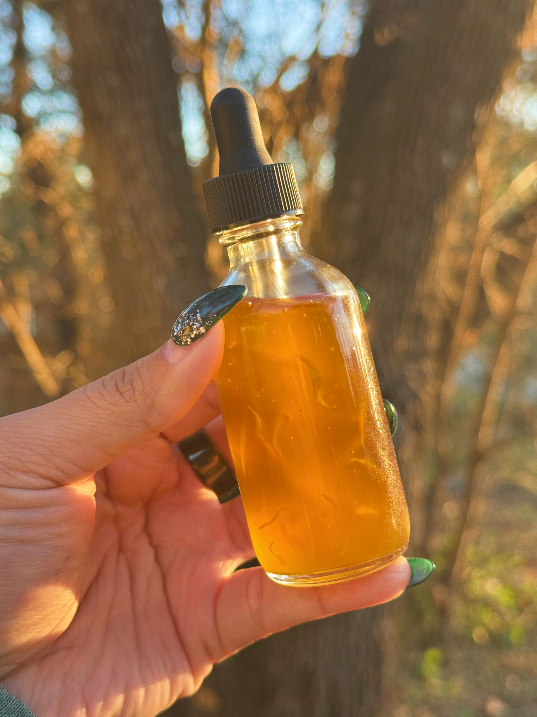 Golden Hour Oil has been solar infused for 8 weeks! When we can, we prefer to do solar infusions as this allows not only the herbs to slowly release their medicinal properties, but it also allows the oil to absorb the suns healing energy. Apply directly to skin or hair. You will receive 1 2oz dropper bottle.