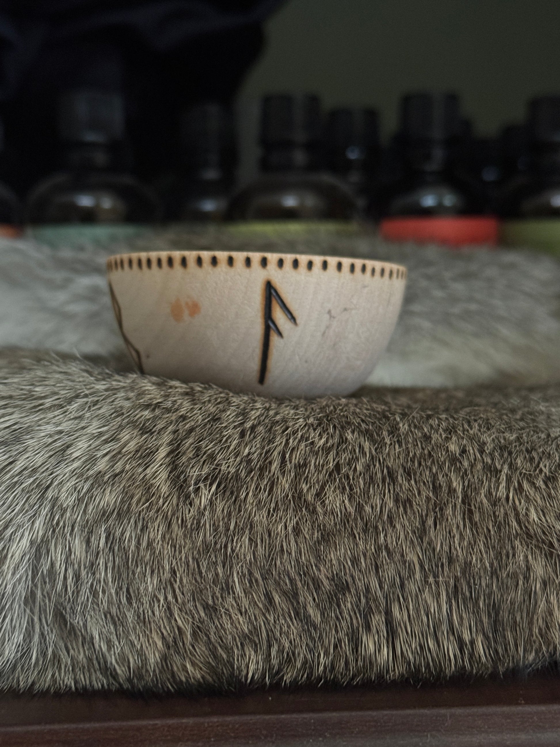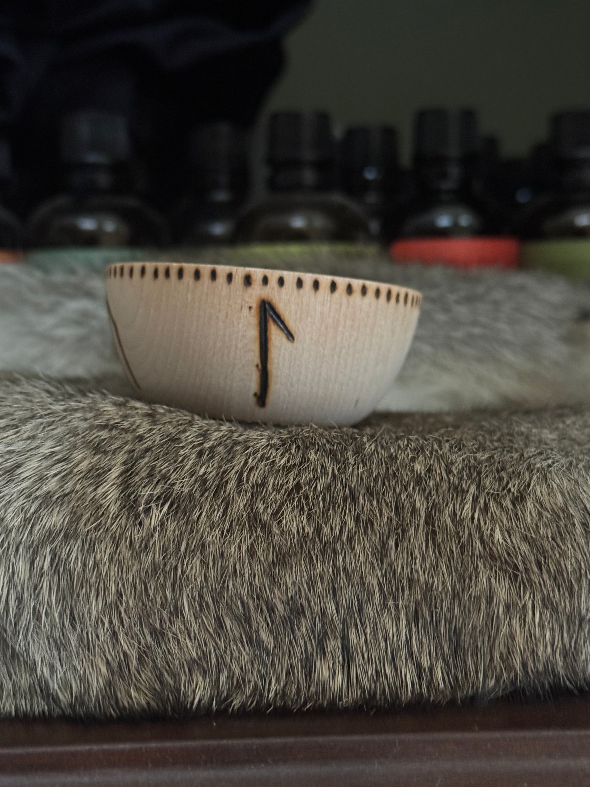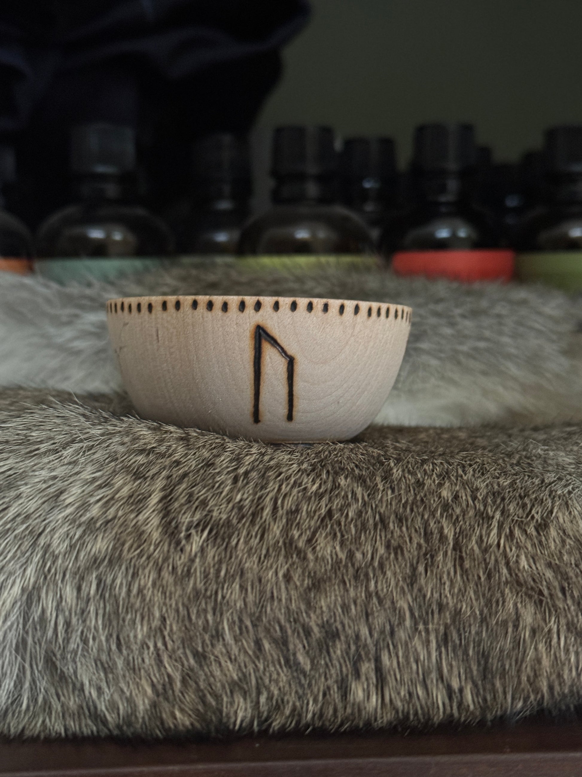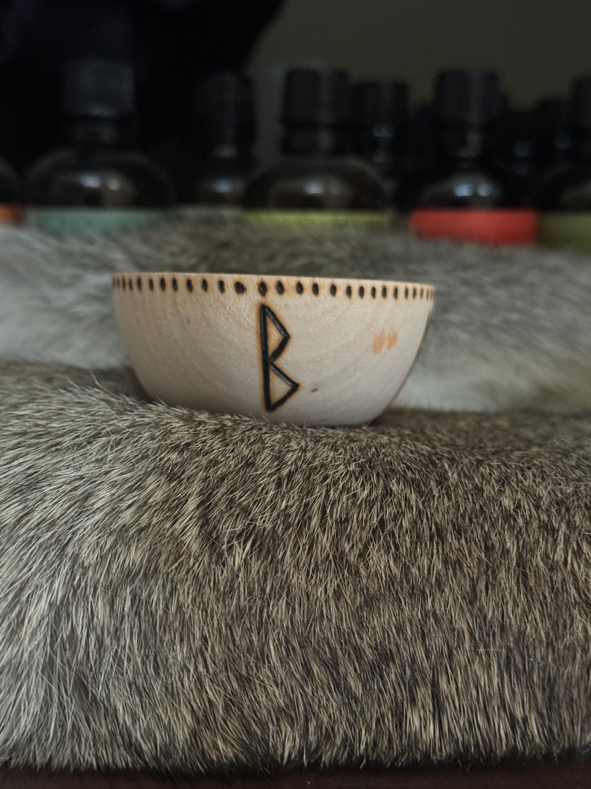 This hand burned mini bowl has the Elder Futhark runes Berkana, Ansuz, Uruz, and Laguz. These are good runes to work with when channeling healing energy. You will receive the bowl pictured and it is roughly 2.5" wide.