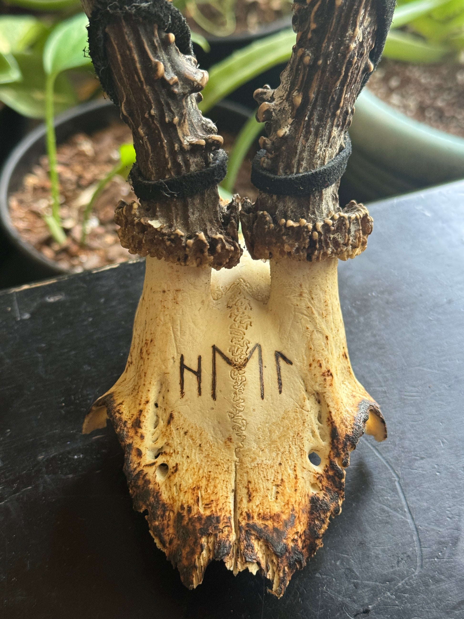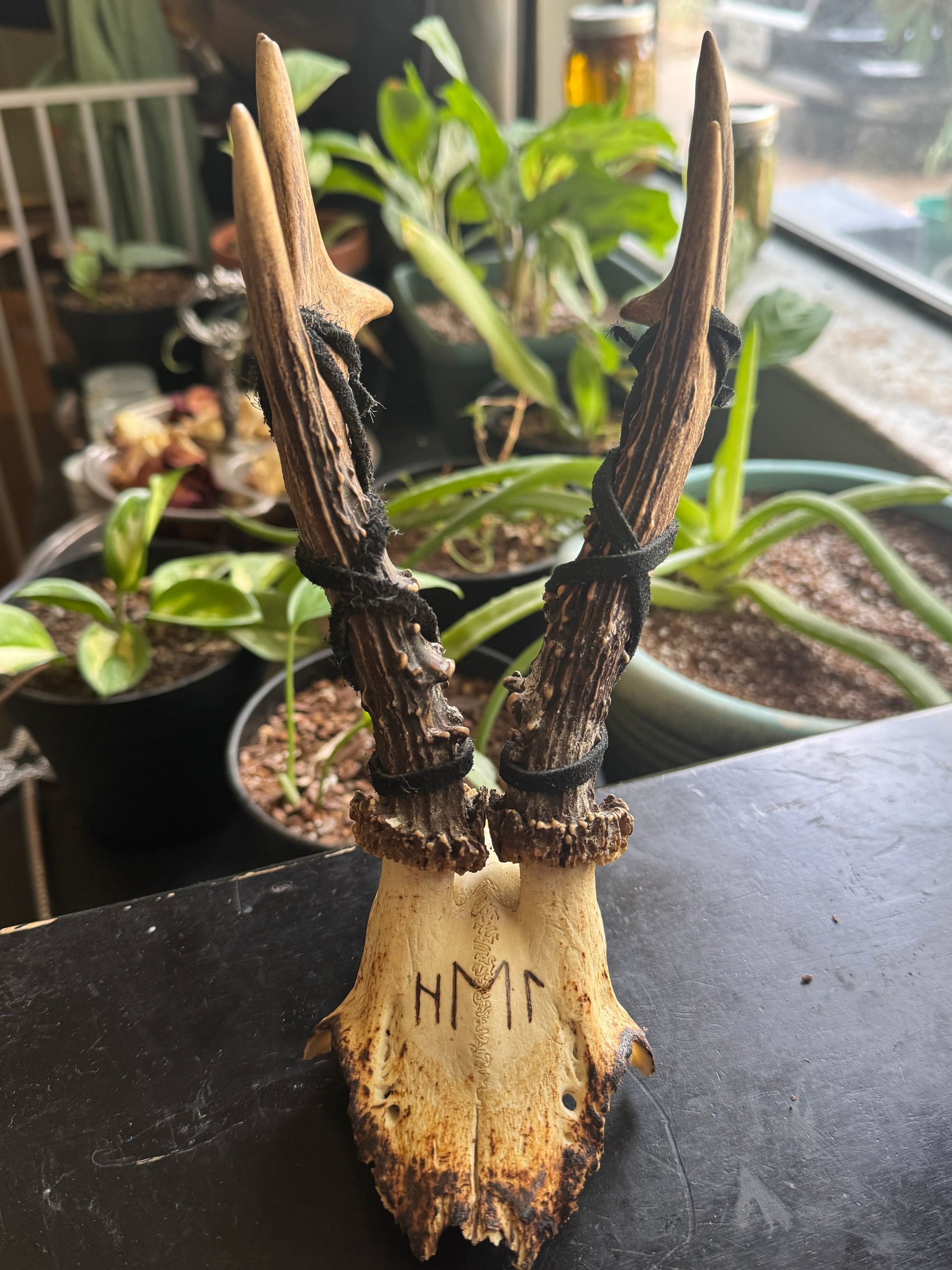 This beautiful Roe Deer skull was ritually hand burned with the Elder Futhark runes Hagalaz, Ehwaz, and Laguz. Loosely spelling out Hel, as this is who we dedicated this skull cap to. We then wrapped the antlers with deer lace. You will receive the skull pictured.