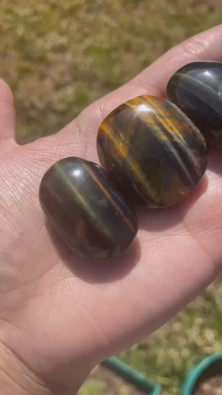 Tigers Eye is the stone of protection, luck, and prosperity. It also enhances your confidence and your mood, and is tied to the sacral and solar chakras. Blue Tigers Eye, also known as Hawks Eye, is tied to the throat and third eye chakras. Its great for bringing new job opportunities, and helping to strengthen your intuition. You will receive 1 intuitively selected stone. Small weighs roughly 1-2oz and large weigh roughly 2-3oz.