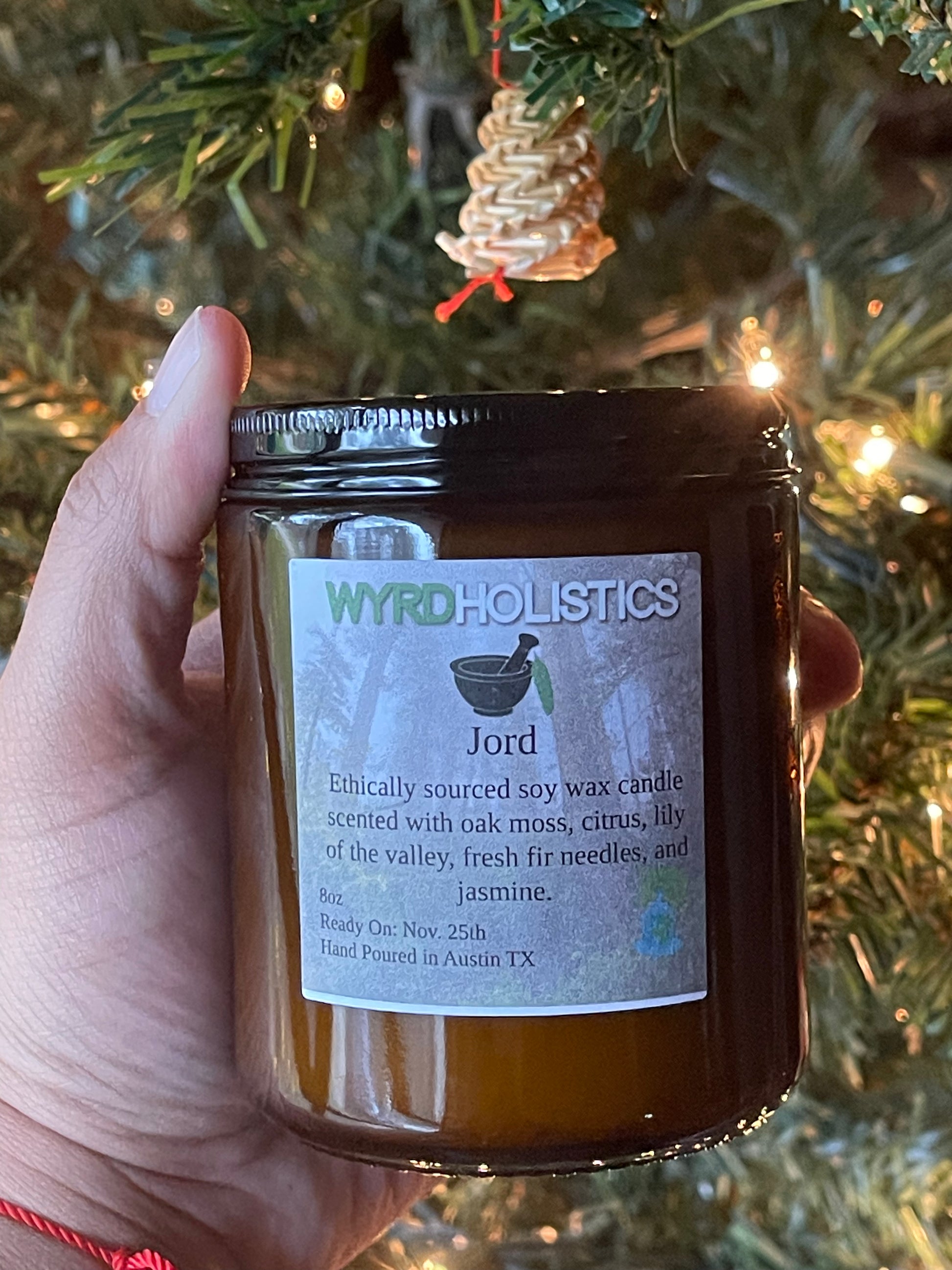 We use ethically sourced organic soy wax, vegan cruelty free fragrance oil, and a glass container for you to reuse! We also hand pour each and every candle we produce! Jord is scented with oak moss, citrus, lily of the valley, fresh fir needles, and jasmine.
