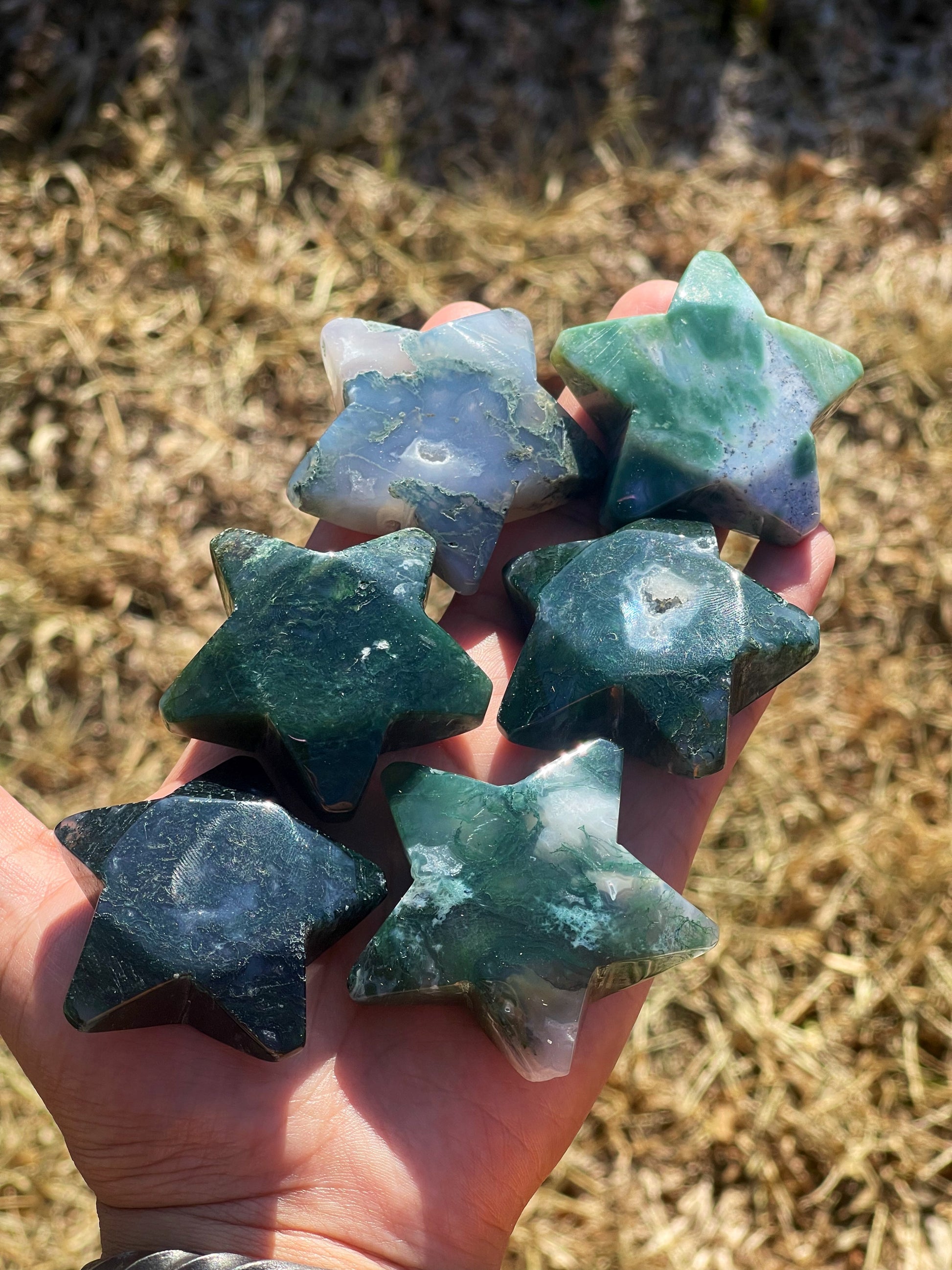 Moss Agate is associated with nature, agriculture, and new beginnings. Its a great grounding stone to have as you transition in life and brings Earth energy in. It also helps to release old habits that no longer serve you and promote forgiveness. You will receive 1 intuitively selected star.