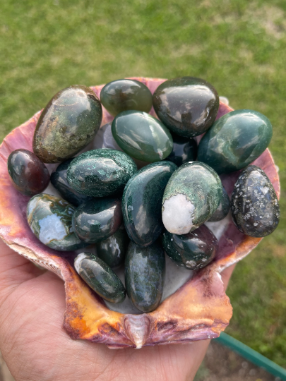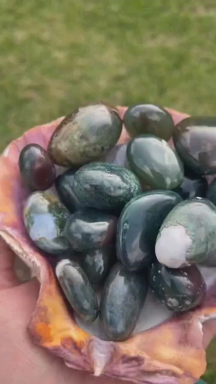 Moss Agate, also known as The Garners Stone, is tied to the root and heart chakras. It can reduce emotional trauma, promote spiritual growth, promotes forgiveness and happiness, and can be a great stone to work with for shadow work. It can also bring one balance and stability. Some of these tumbles have pink/purple moss agate, we will intuitively select 1 tumble for you.