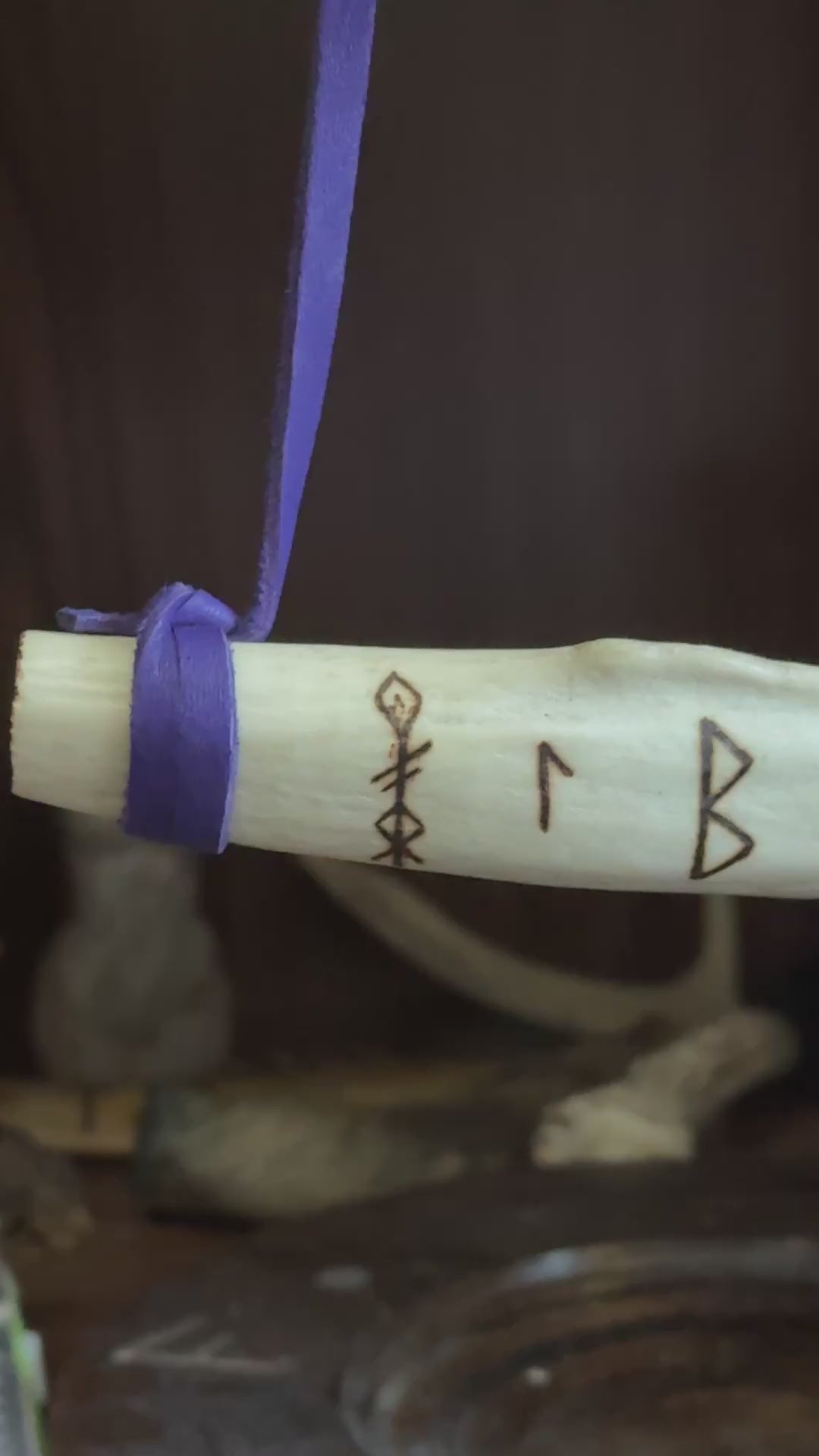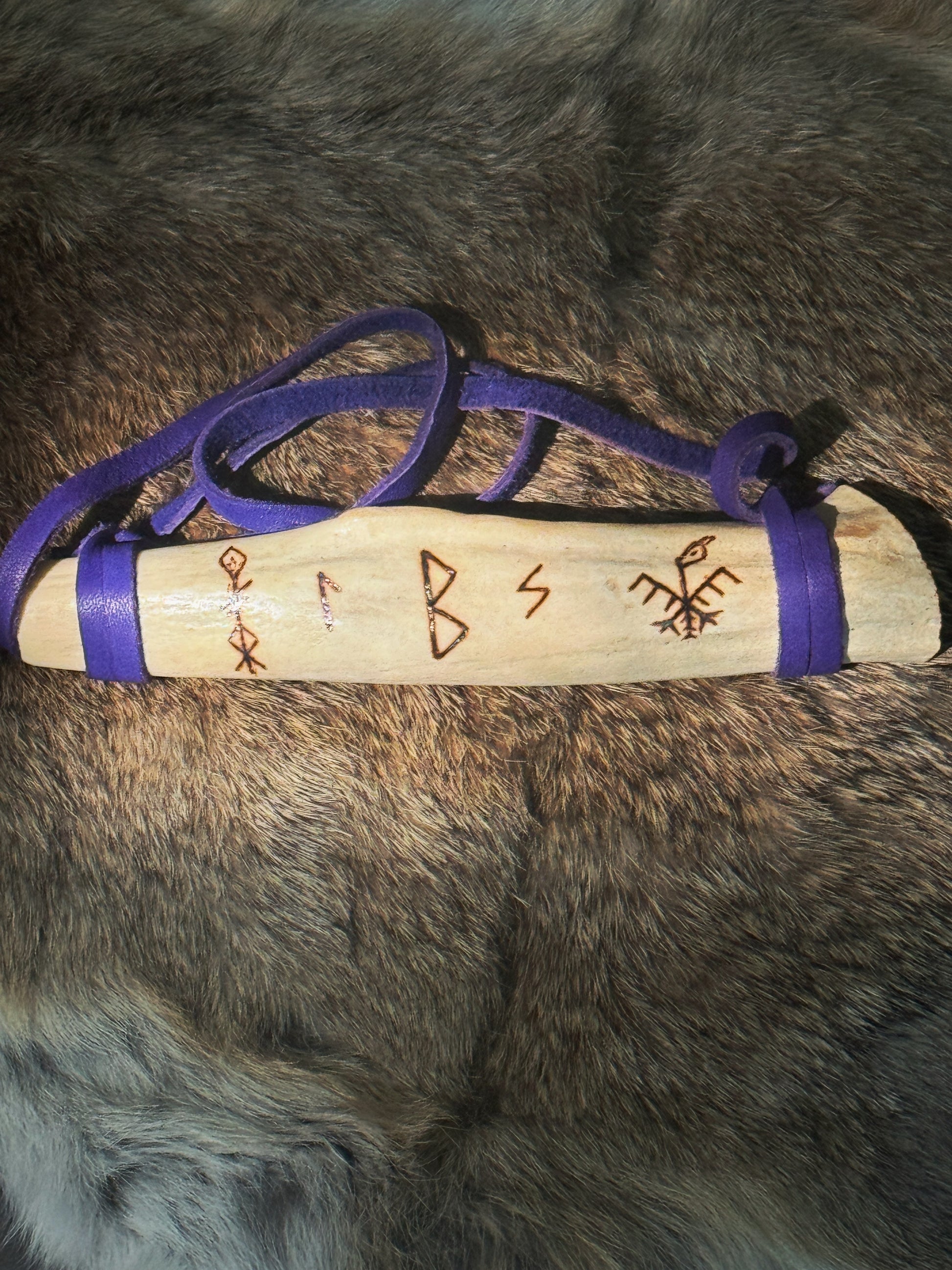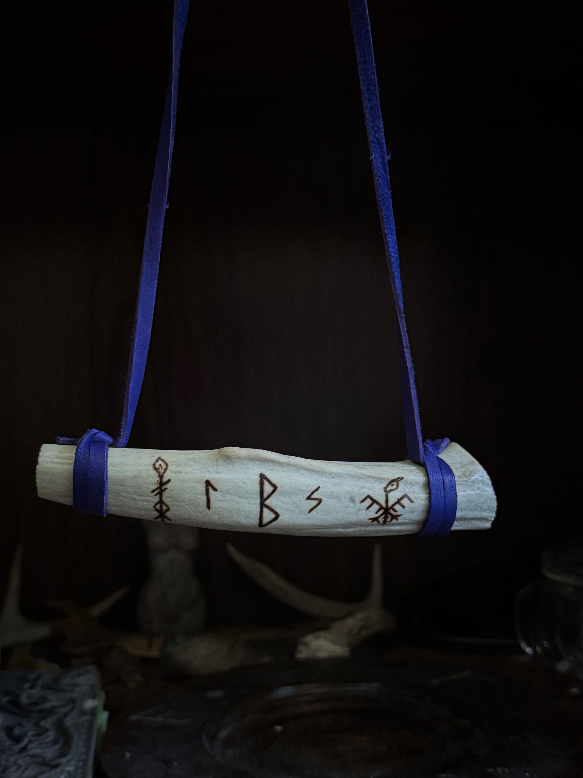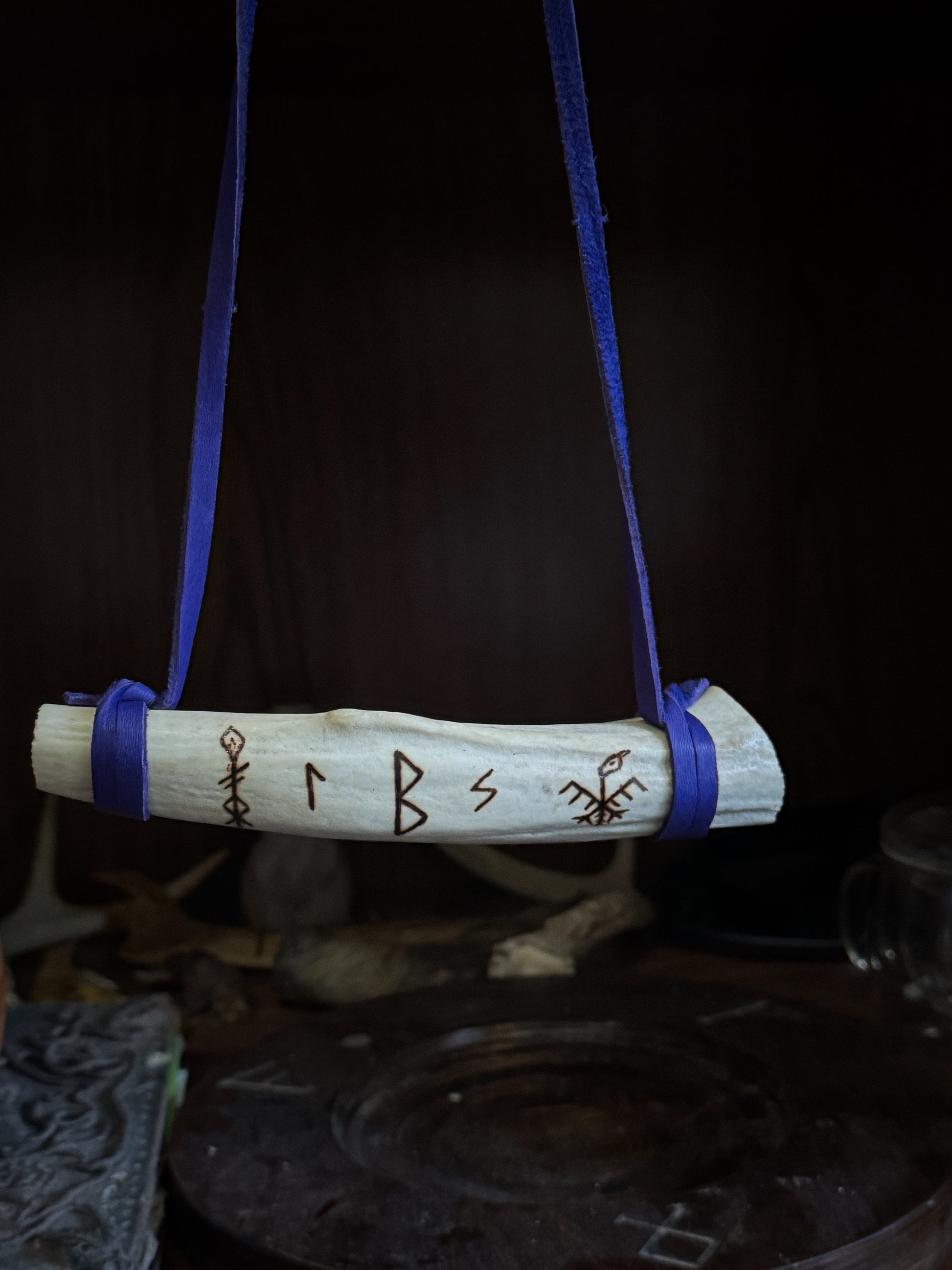Ritually hand burned deer antler to bring wisdom and guidance for new journeys. The spear of Odin has been said to represent wisdom, and we added a bird to represent guidance from the gods and ancestors. The Elder Futhark runes Laguz, Berkana, and Sowelo have been added to bring in fluidity of life, growth for new beginnings, and passion for knowledge. You will receive the piece pictured.