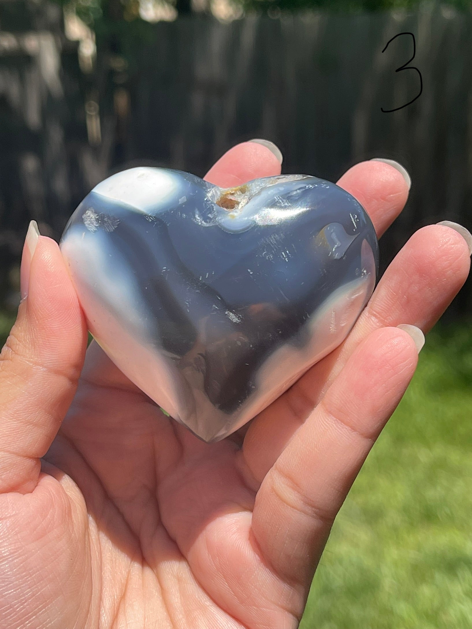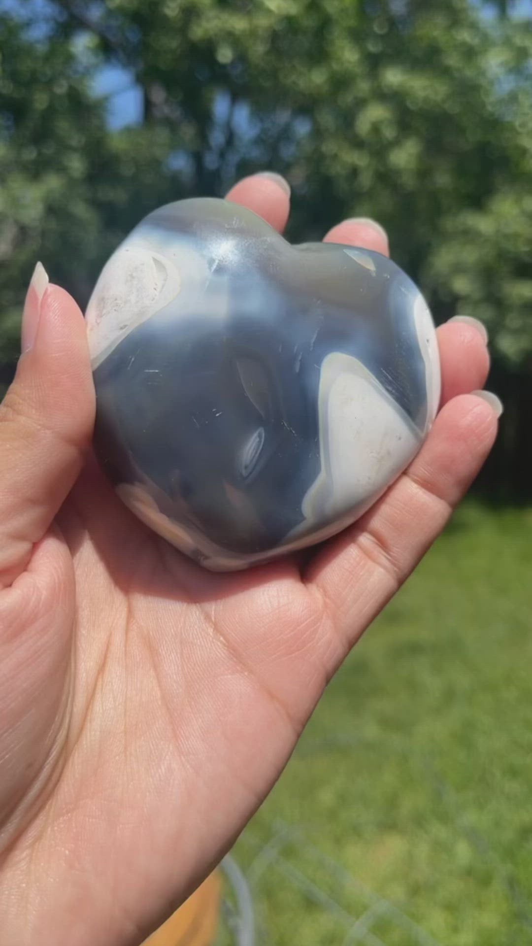 Orca Agate is healing, grounding, and balancing. It is tied to the 1st and 5th chakras and originates in Madagascar. Its soothing energy pairs great with Aquamarine.