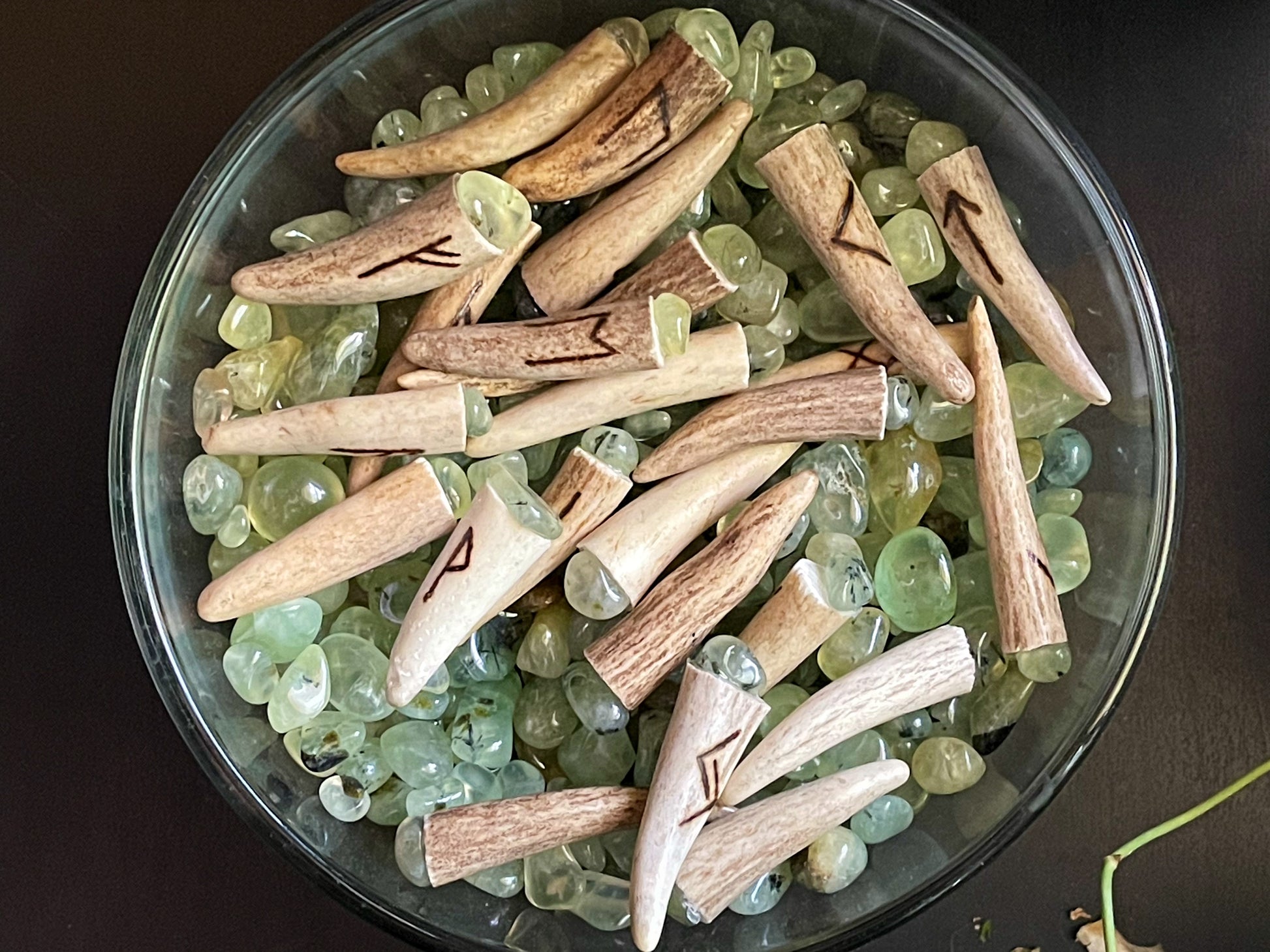 When we create these rune sets its in a ritual setting. We thank the animal they came from, in this case these are deer antler tips, and cleanse them before starting. We then blast our favorite music, at the moment its anything Heilung. While we are hand burning each of these runes we galdr to bring them to life. Galdr is an old style of chant, each rune has its own galdr, and while we do this we are awakening the magic of each rune. For this set we chose to use Prehnite on the tops. Prehnite is associated with the heart chakra and is a great healing stone for healers to work with. It can also bring calming energies much like Mother Earth so its also good for grounding. It can also help connect to higher energies so we felt it was a perfect stone for this divination set. You will receive 1 set of hand burned runes on antler tips in a bag.