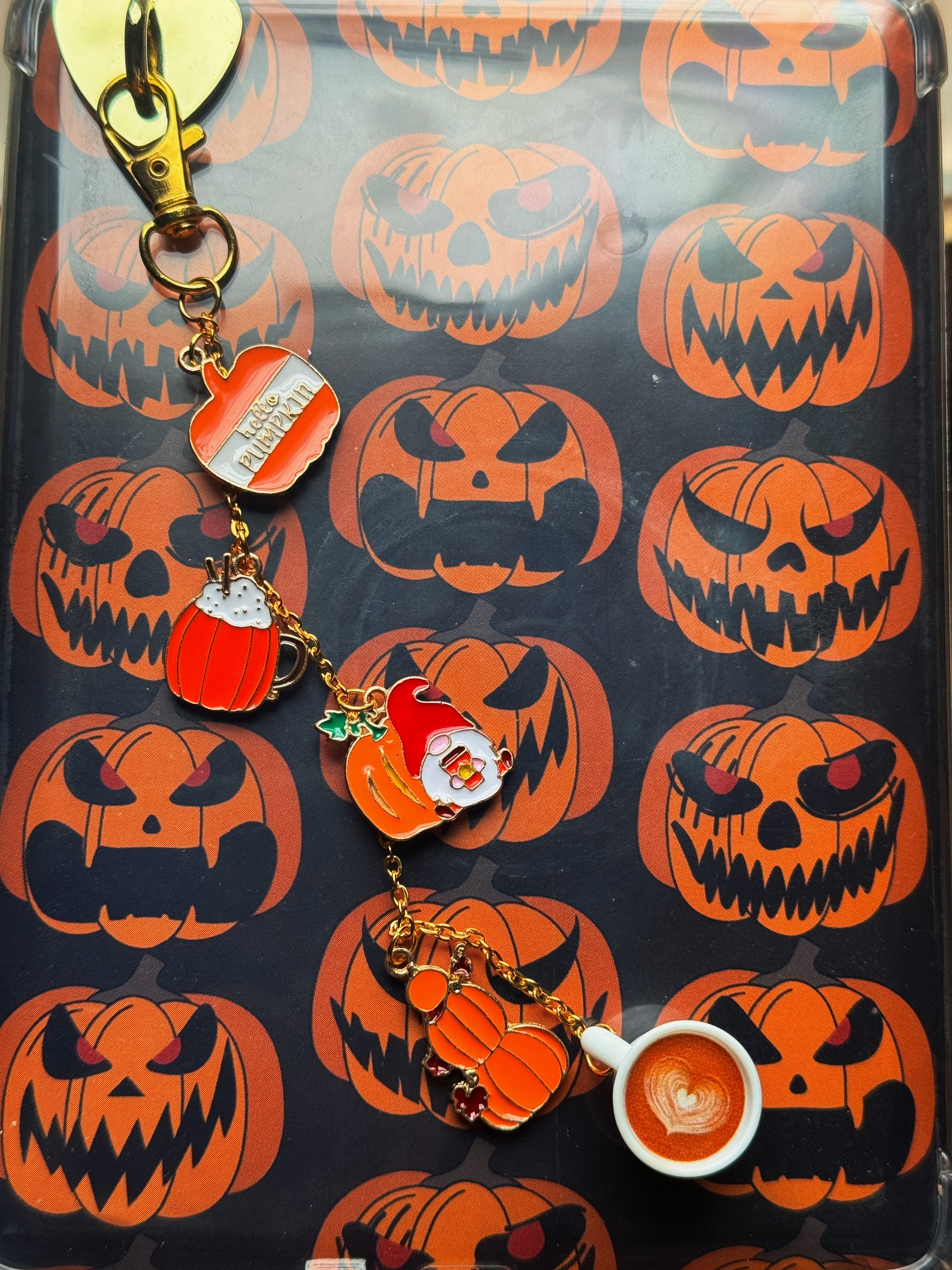Pumpkin Spice is a gold base with a hello pumpkin, pumpkin spice drink, a gnome, pumpkin stack, and a cup of warm pumpkin spice drink!