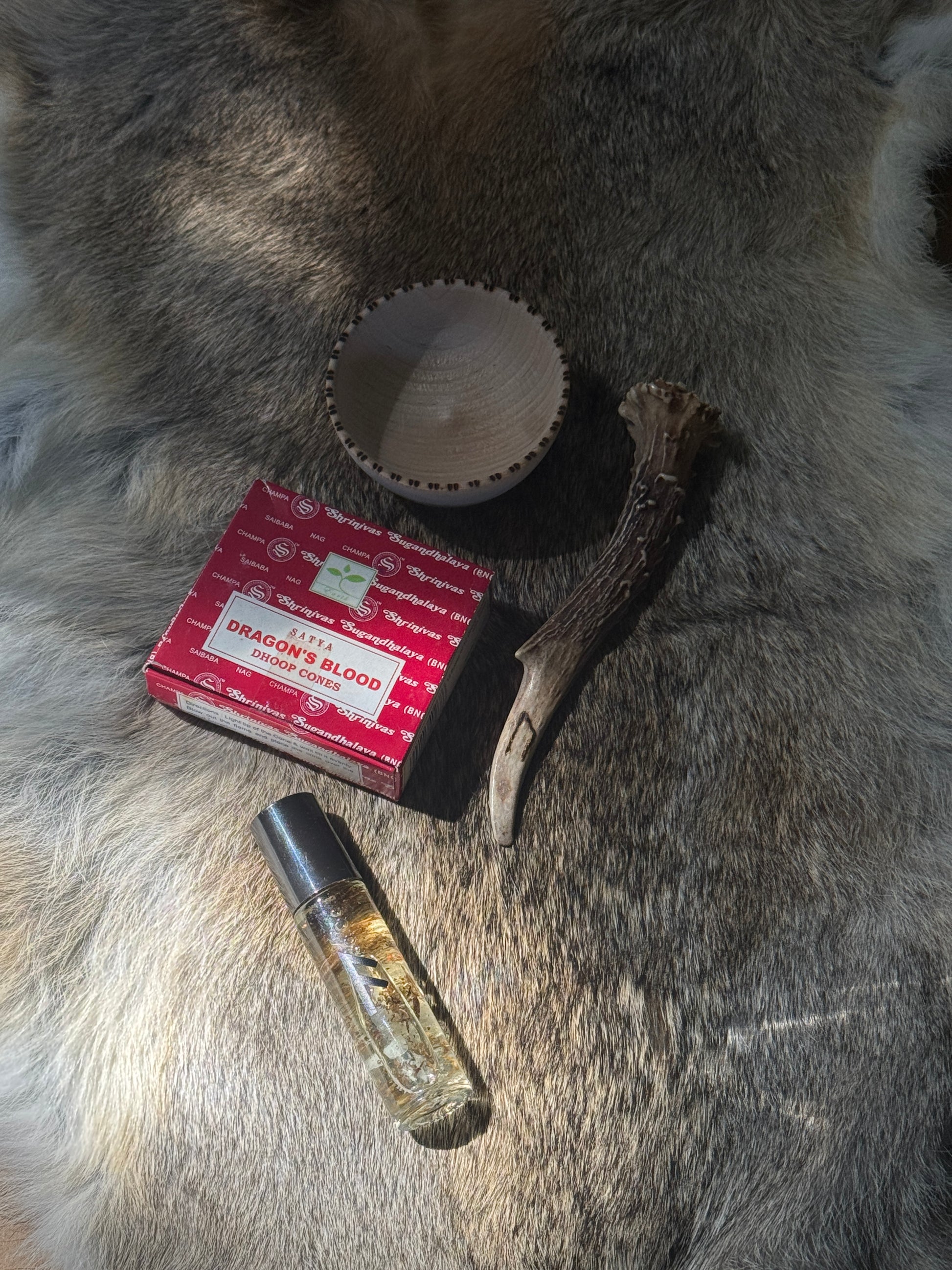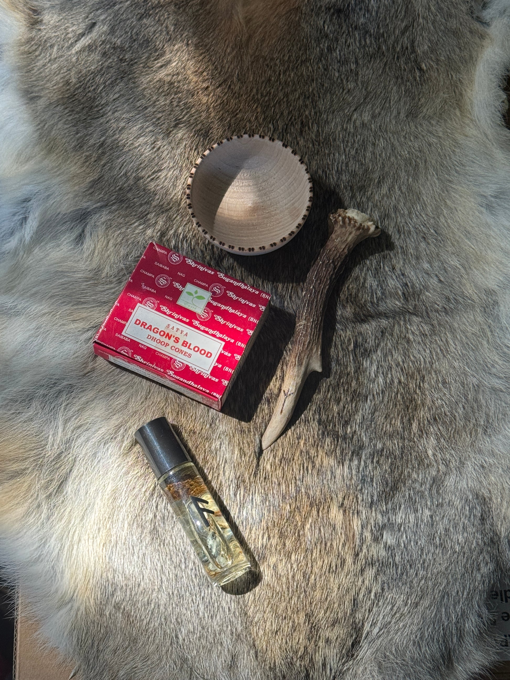 This altar set includes a rabbit fur, a mini altar bowl, dragons blood incense cones, a roe deer antler with Algiz and Uruz hand burned on it, and Ansuz ritual oil. This set is perfect for those adding to their altar or just starting one. You will get the set pictured.
