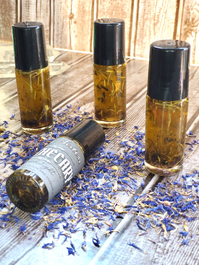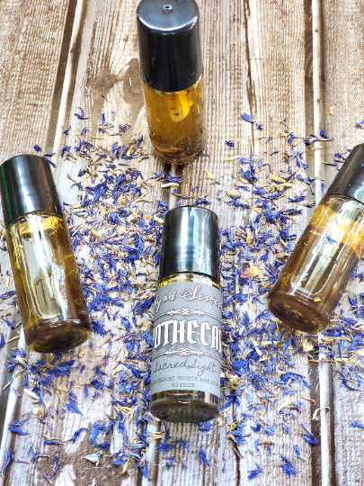 Sacred sight was infused for 6 weeks with herbs like mugwort, blue cornflower, mullein, and palo santo. Apply Sacred Sight to chakras and pressure points to aid in getting in that calm vibe to allow yourself to receive messages. We left this oil unscented so the herbal smell could really come through from the infusion. As always, when applying keep your intentions in mind as we have done while creating this beautiful blend.