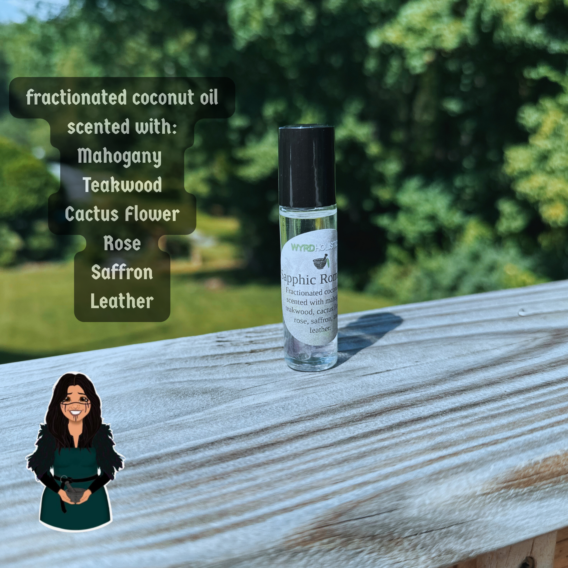 Sapphic Romance is scented with mahogany teakwood, cactus blossom, rose, saffron, and leather. You will receive 1 10ml rollerball. Shake well before each use.