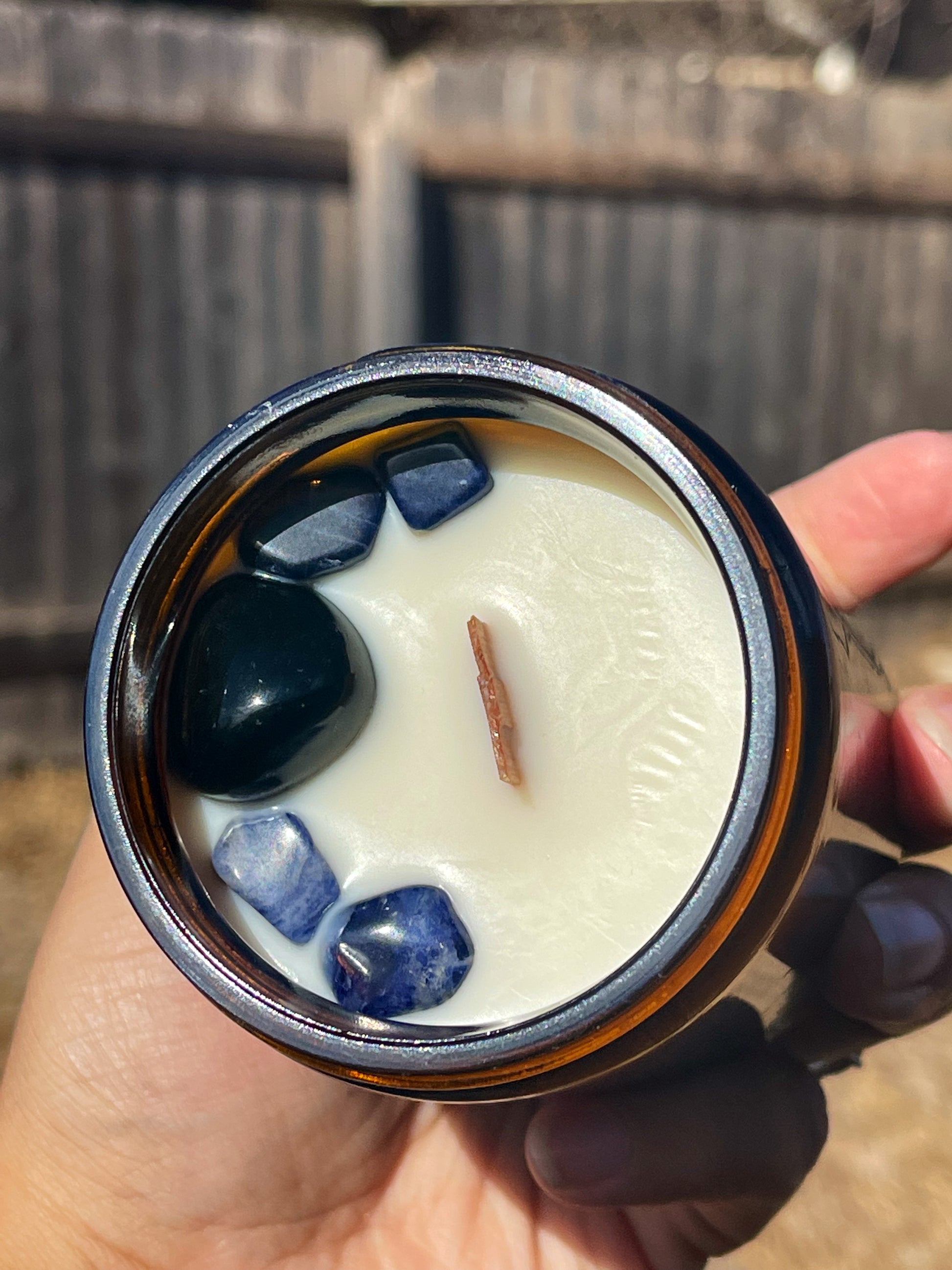 We use ethically sourced organic soy wax, vegan cruelty free fragrance oil, and a glass container for you to reuse! Gather around the fire while the Seeress tells us what she sees. This candle smells of patchouli, resin, cedarwood, clove, smoke, and magic. We adorned it with an Obsidian tumble and Sodalite chips. you will receive 1 hand poured candle.