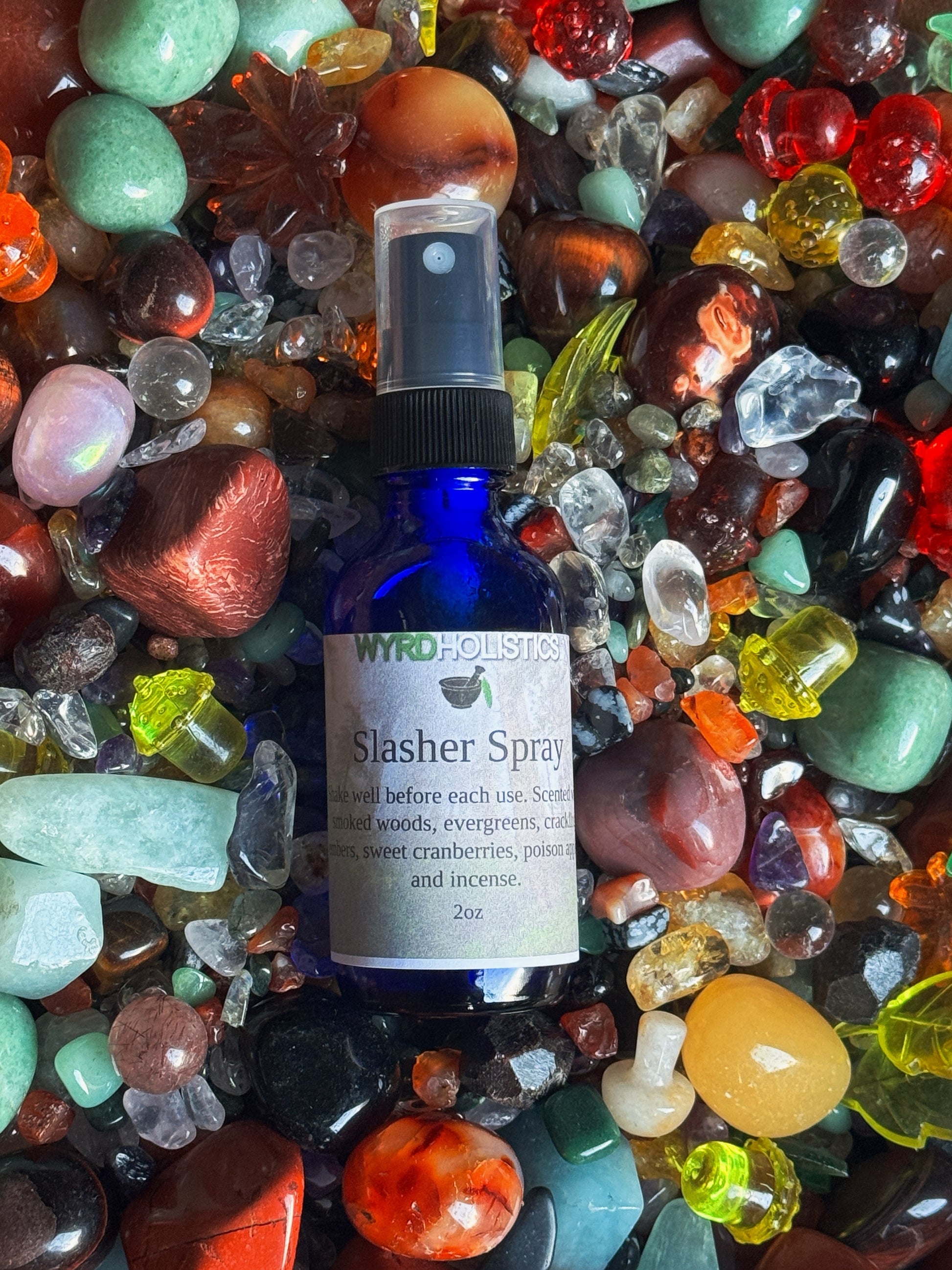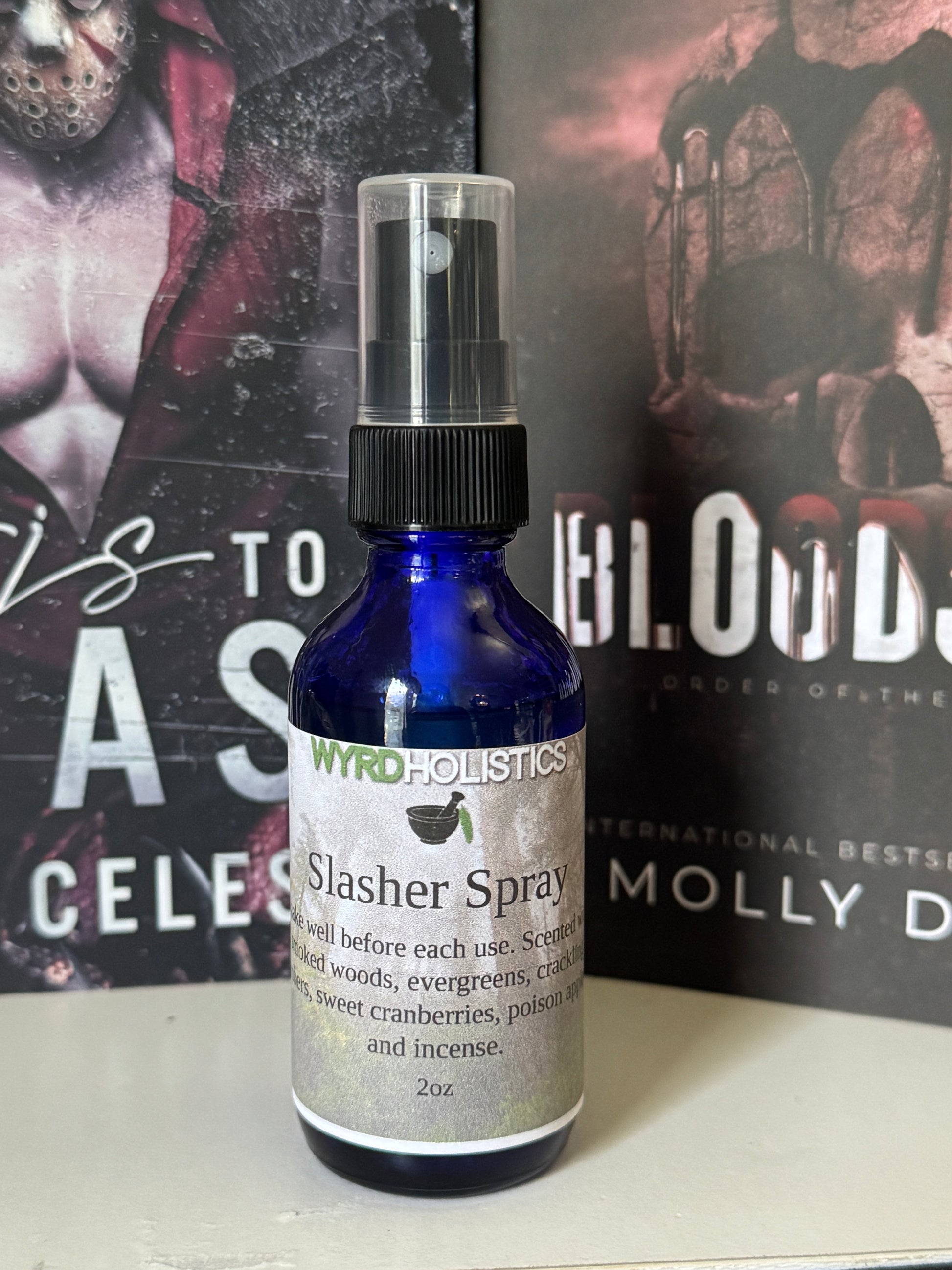 Slasher is scented with smoked woods, evergreens, crackling embers, sweet cranberries, poison apples, and incense. You will receive 1 2oz spray bottle.