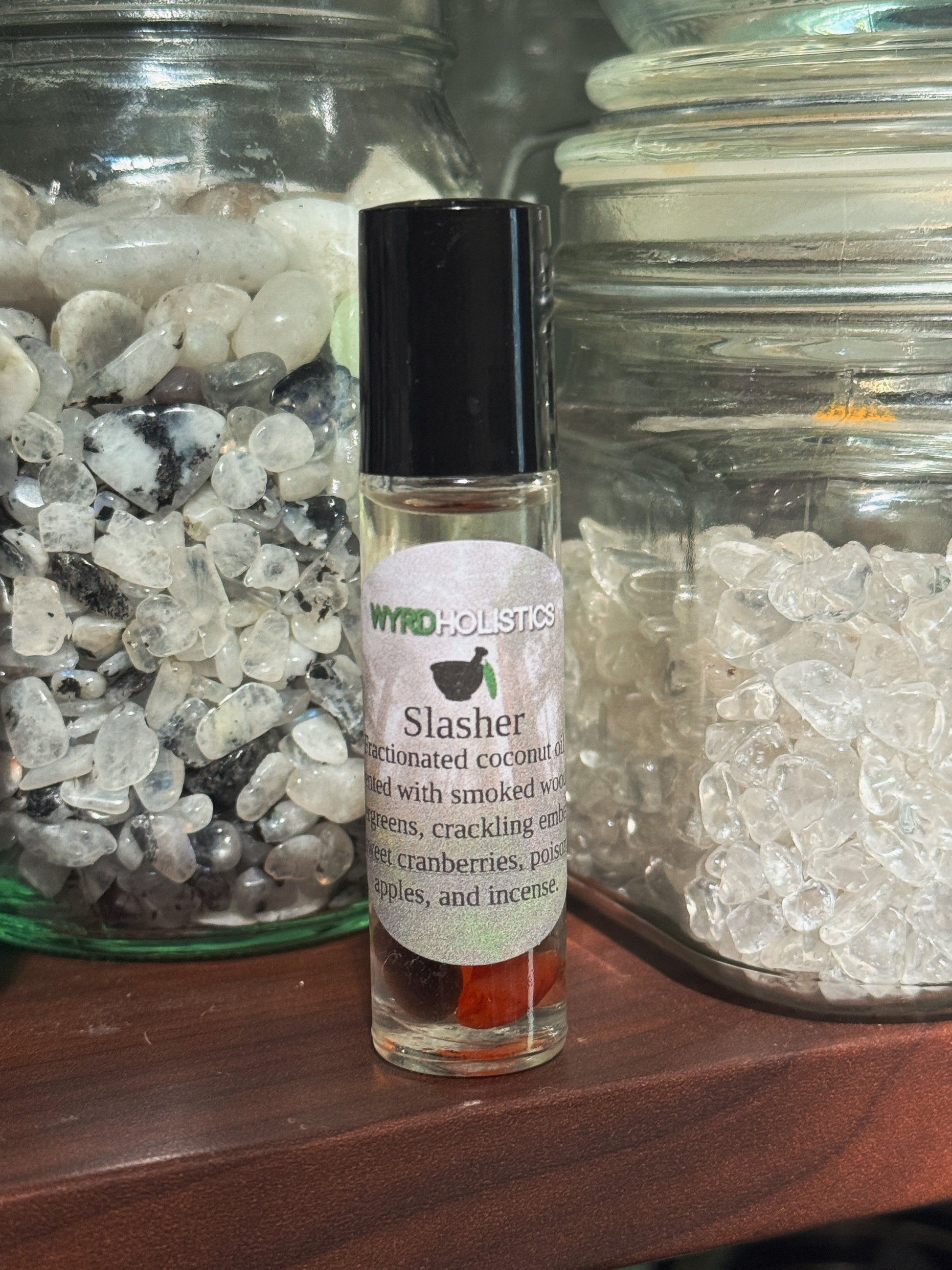 Whats your favorite slasher movie? Book? Slasher is scented with smoked woods, evergreens, crackling embers, sweet cranberries, poison apples, and incense. You will receive 1 10ml rollerball. Shake well before each use.