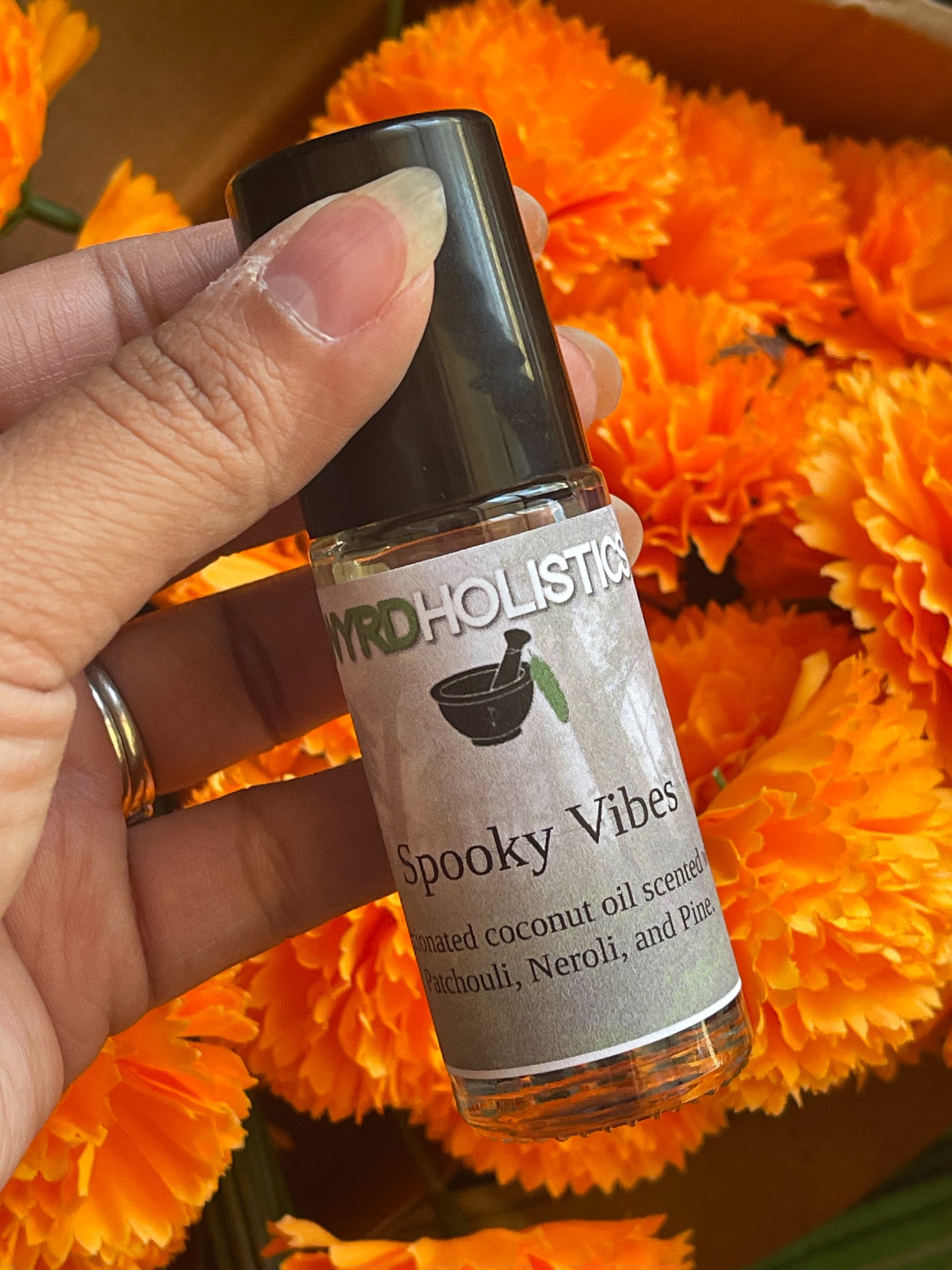 Spooky Vibes has a base of fractionated coconut oil and is made with essential oils of Neroli, Pine, and Patchouli. This is a 30ml (1oz) rollerball, you receive 1.
