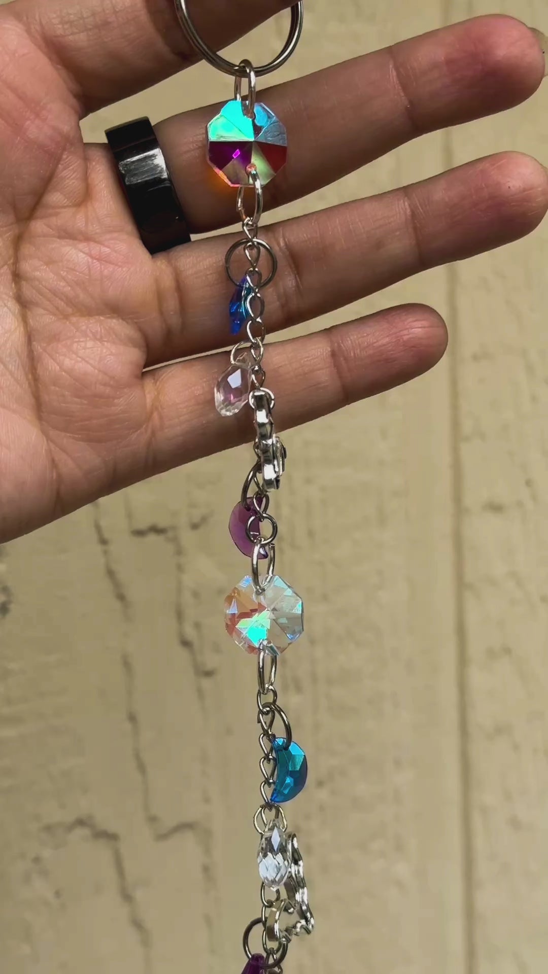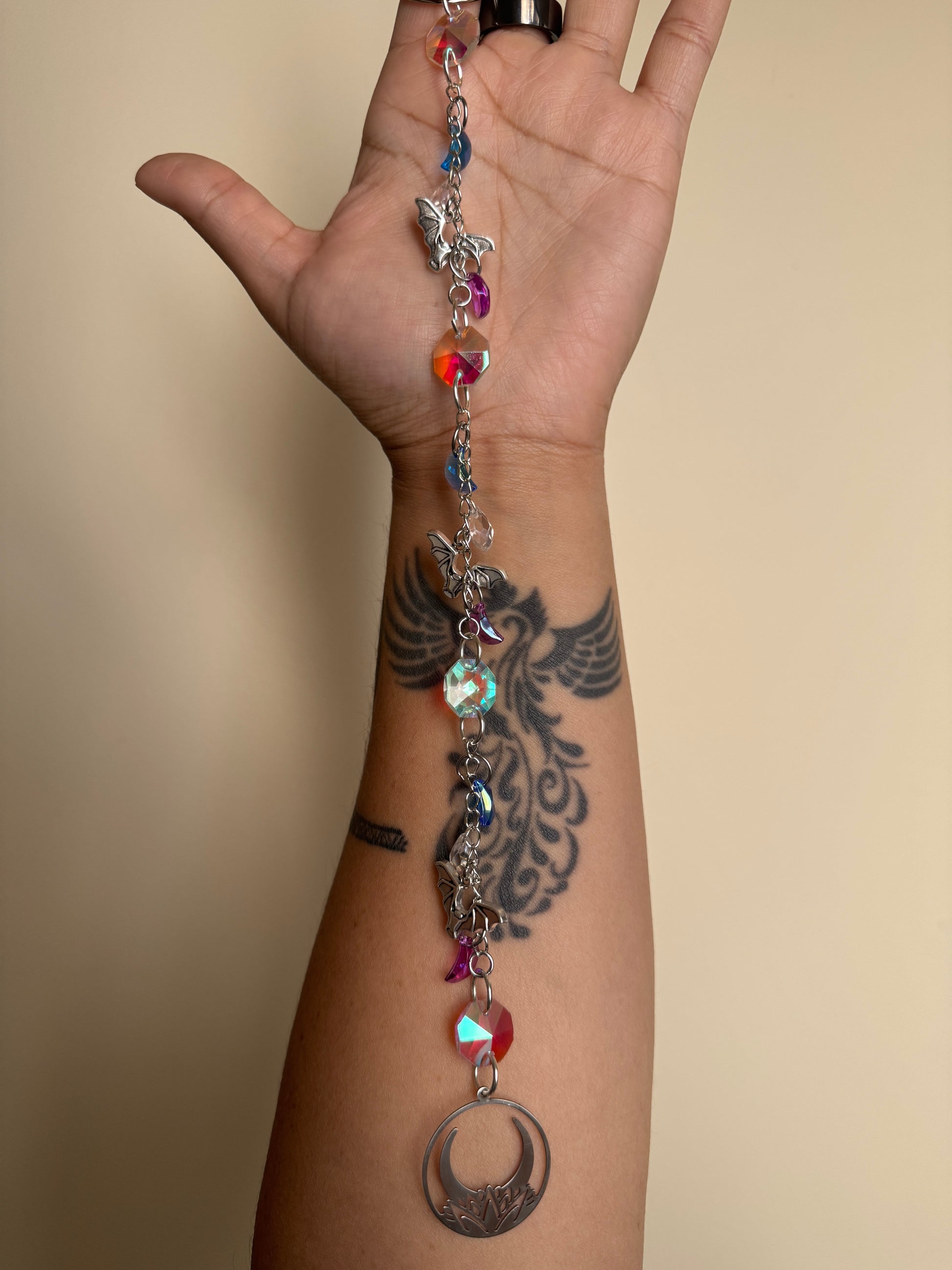 This beautiful hand made sun catcher has sapphire blue and deep purple mini crescent moon charms, bat charms for our bat boys, clear octagon charms, and clear star drop charms. We paired these with a beautiful crescent moon and lotus charm at the bottom. You will receive the sun catcher pictured.