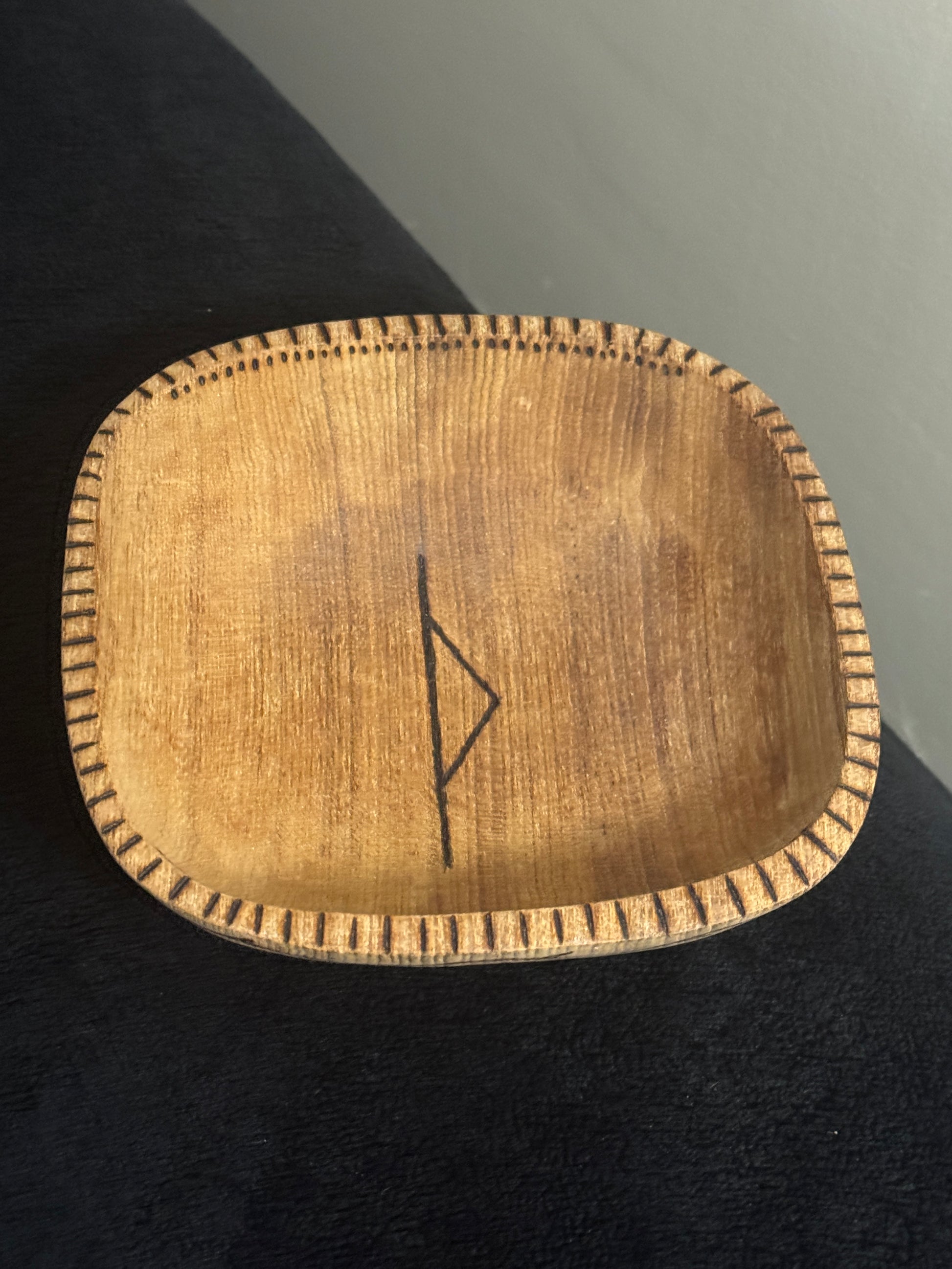 This altar bowl was ritually hand burned with the Elder Futhark Rune Thurisaz on the inside. We also added a vine of thorns going around the outside with a Mjolnir on the front. Inside the Mjolnir we added the Elder Futhark Runes Thurisaz, Othala, and Raido. You will receive the bowl pictured.