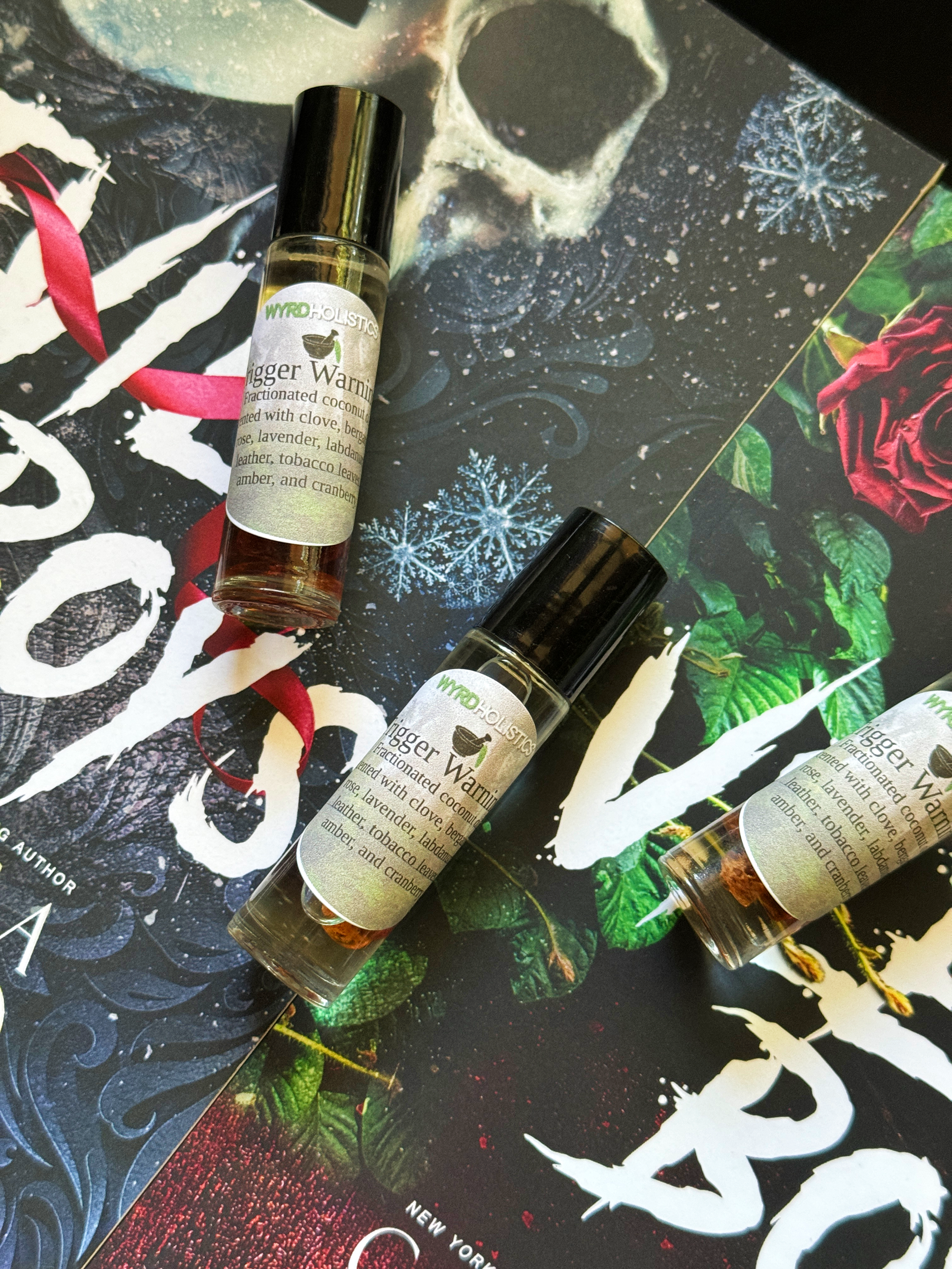 Trigger Warnings, or I like to call them my shopping list, are typically listed on all "dark" books. They will tell you the content in the book so you know wether you want to read the book or not. Personally, I like my Trigger Warnings multiple pages long. For this oil I wanted something musky but sweet and dark and alluring. It is scented with clove, bergamot, rose, lavender, labdanum, leather, tobacco leaves, amber, and cranberry. You will receive 1 10ml rollerball. Shake well before each use.
