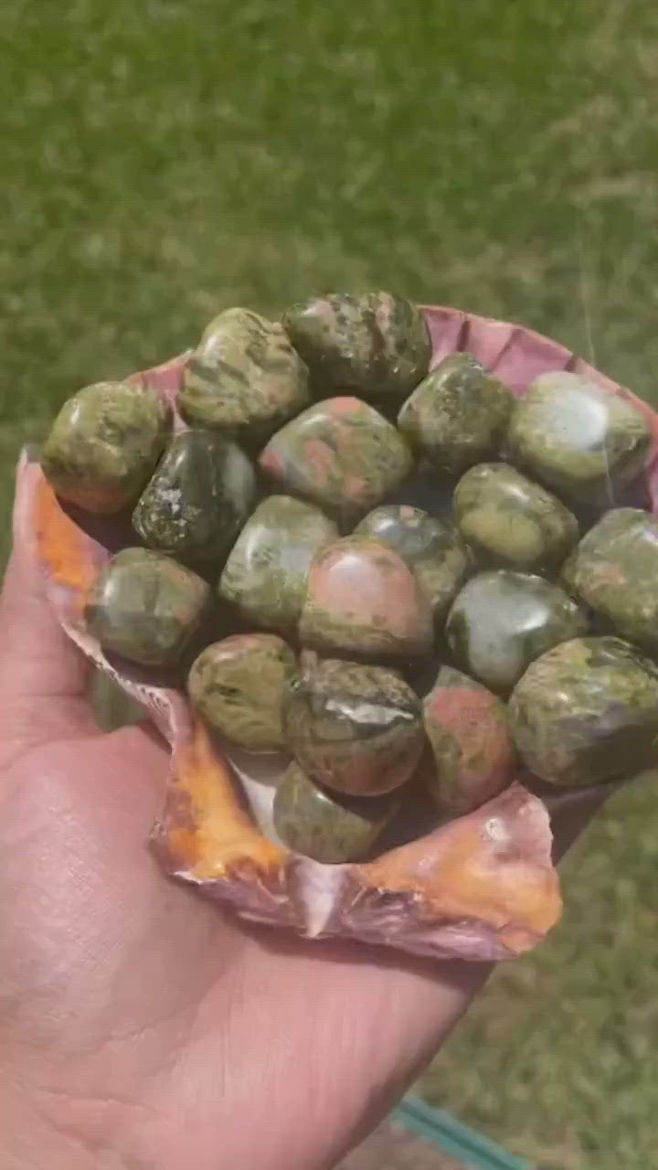 Unakite is tied to the root, heart, and third eye chakras. It can bring alignment, healing, perseverance. It can also aid in developing healthy habits and releasing emotional patterns. This stone can also aid in clairvoyant abilities. We will intuitively select one stone for you, large is roughly around .5oz - .7oz and small are around roughly .3oz.