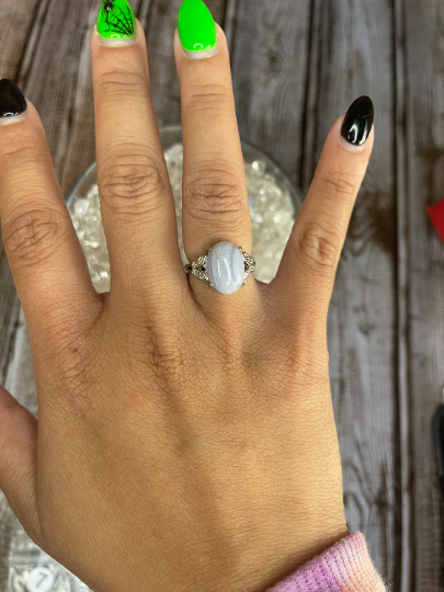 Blue Lace Agate: Ties to the throat and third eye chakras. It has a soothing vibration and helps promote calmness and open communication.