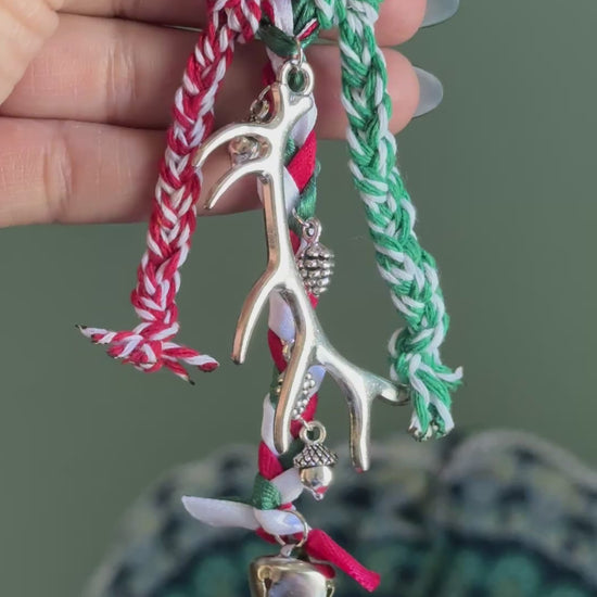 Yuletide has 3 separate hand braided bases. The middle base is made up of green, white, and red ribbons. A silver antler, 2 acorns, 2 pinecones, and 1 silver bell for sound cleansing.